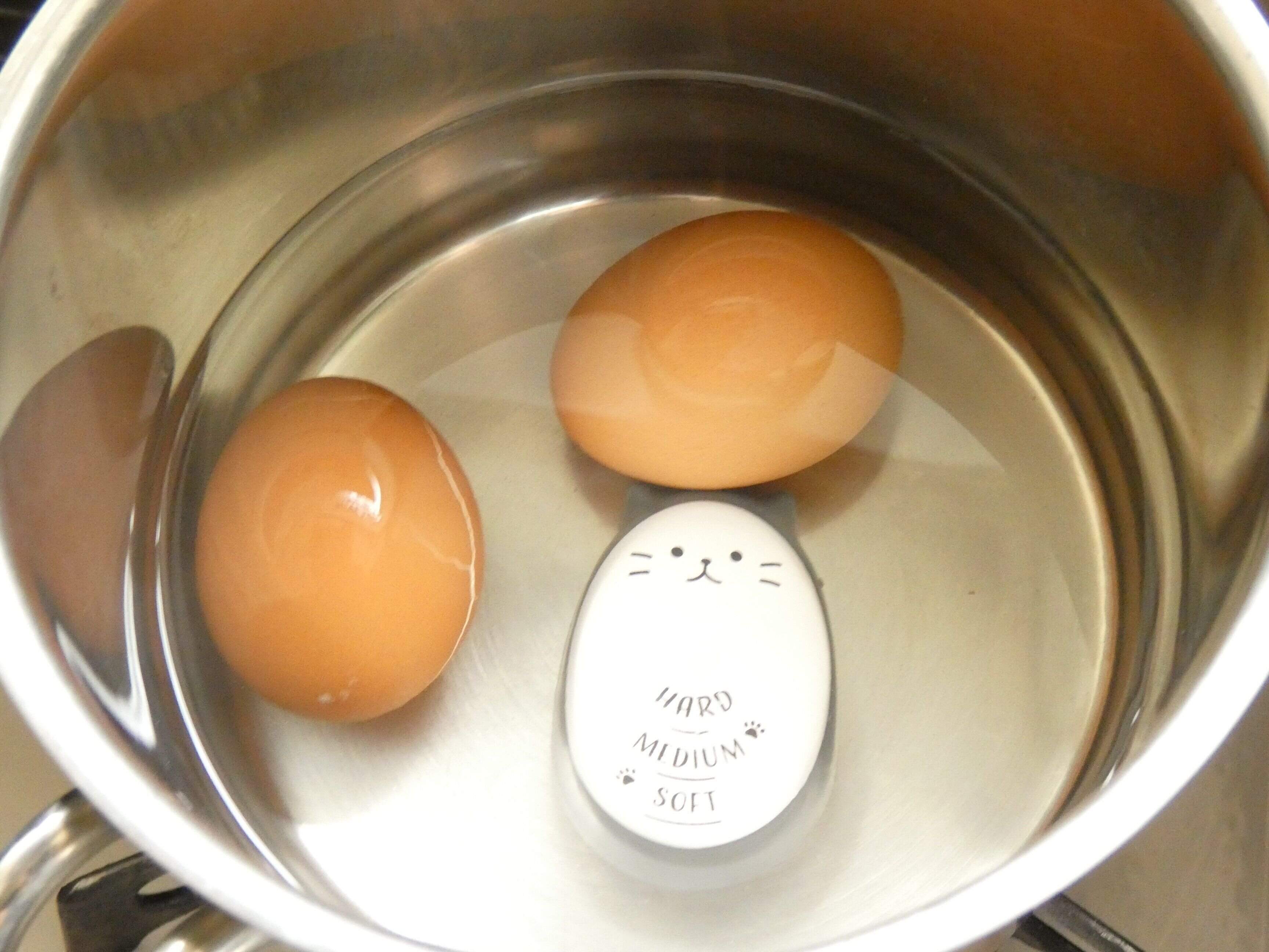 好みの固さまで色が変わったら火を止めて冷水で冷やせばOK。茹でる前はエッグタイマーのかなり色が濃くてHARDやSOFTの文字が見えにくいですが、茹でると白くなるので文字がくっきり見えます。