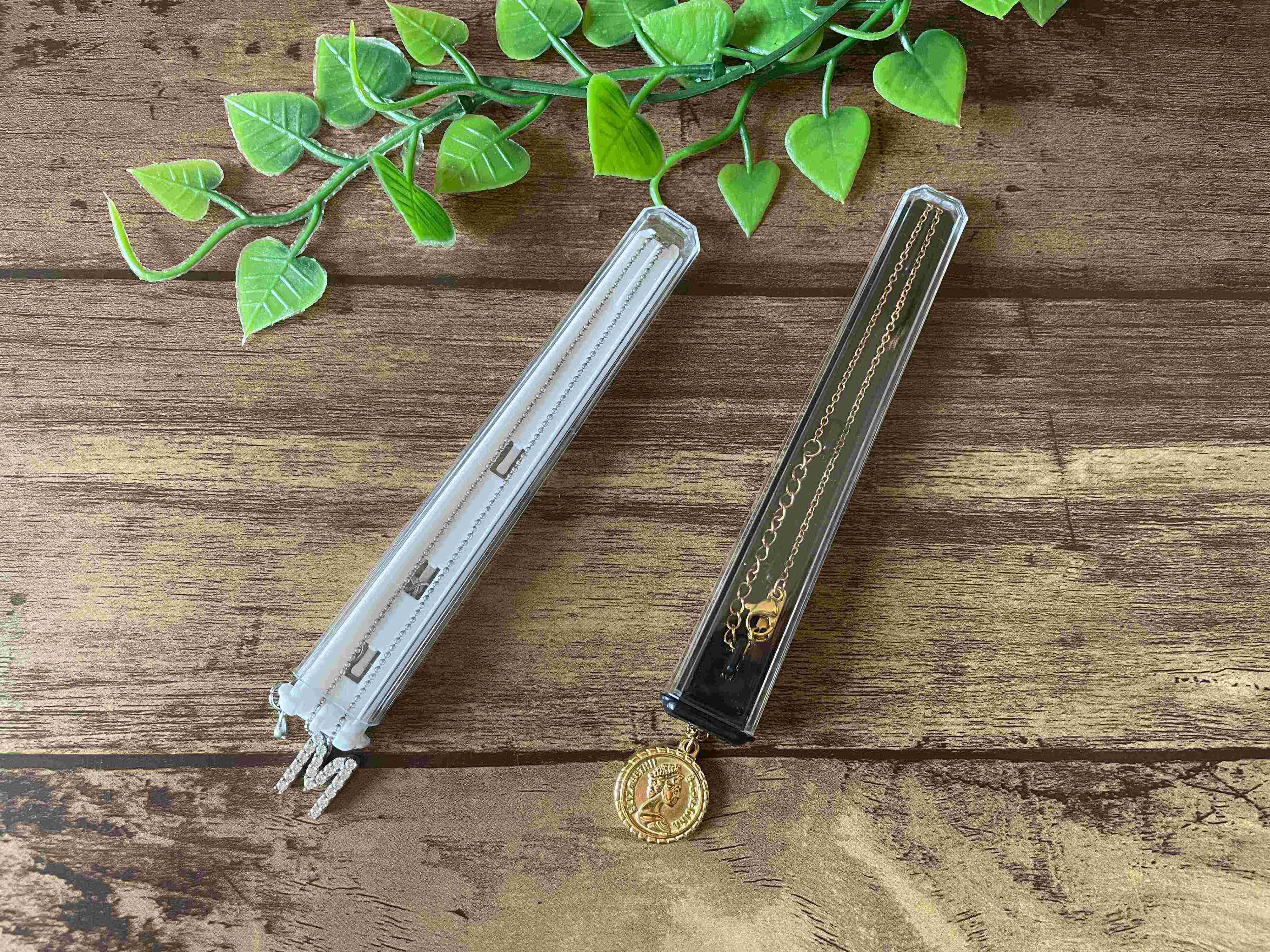 スリムな形だから、収納ケースにも入れやすい。同じスペースに2本のネックレスを入れても絡みません。