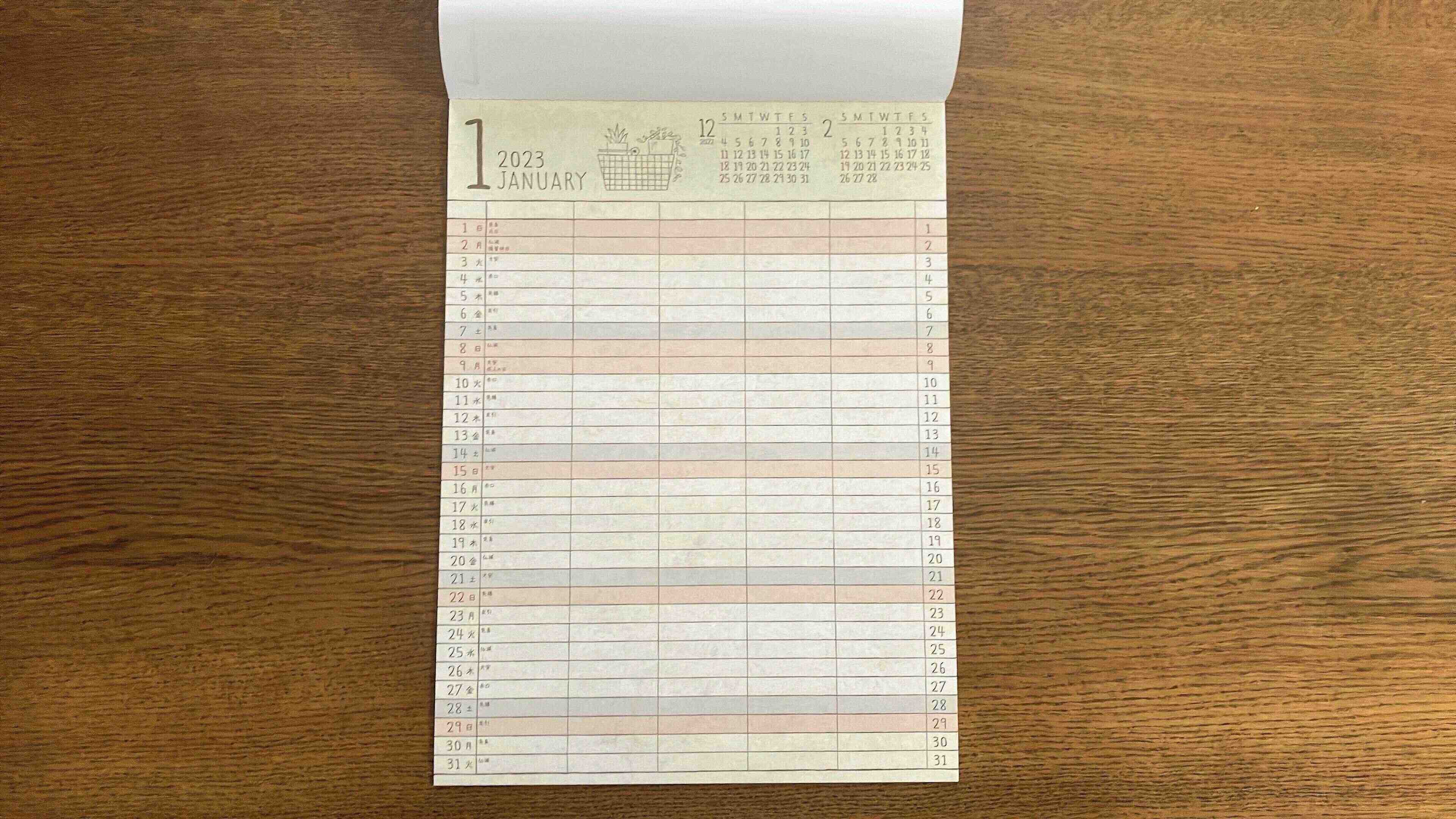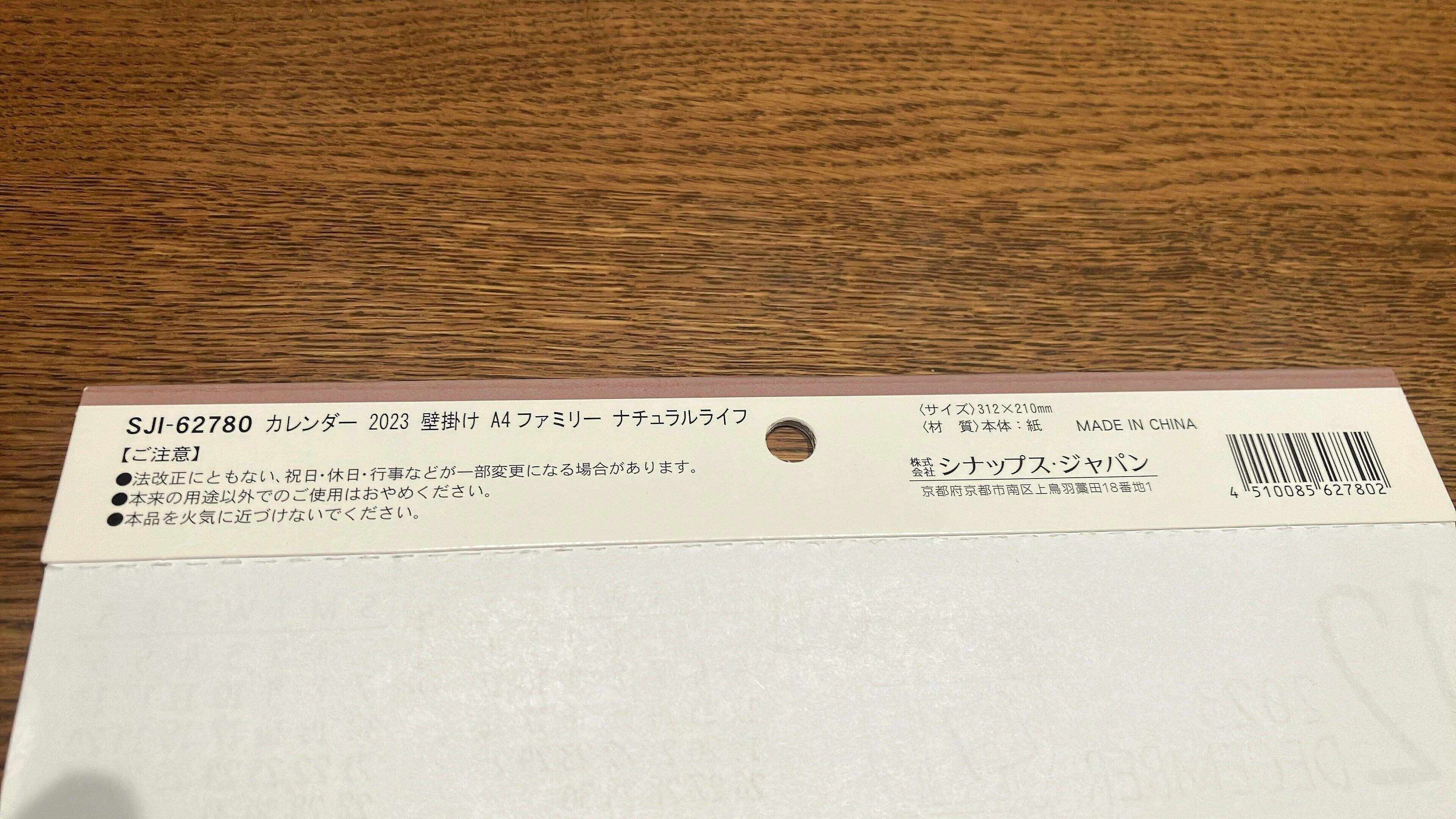 ファミリーカレンダーはわりとカラフルでキャラクターものっていたりしますが、これはシンプル。紙質は厚みはないのですが、コスパを考えると充分です。