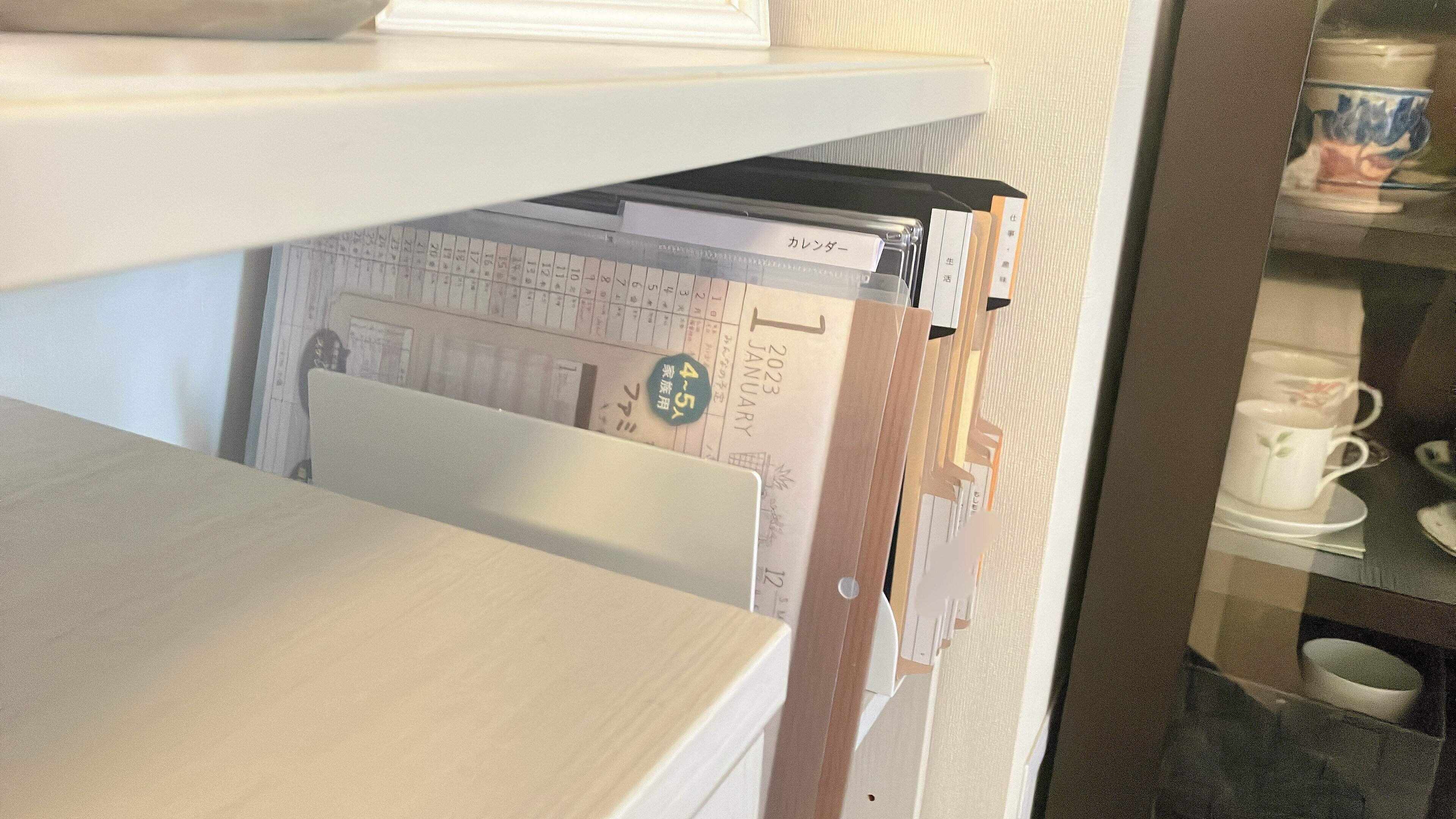 こんな風に書類のファイリングと一緒にダイニングのカウンター下に置いています。