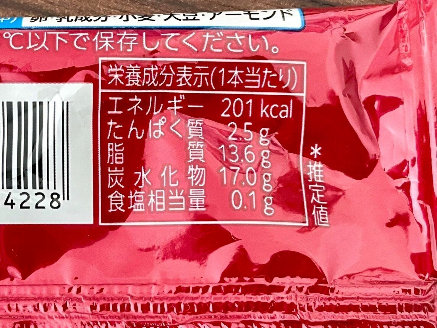カロリーが高そうなものの組み合わせなので、とってもカロリーが高いかと思いきや、1本あたり201kcal。