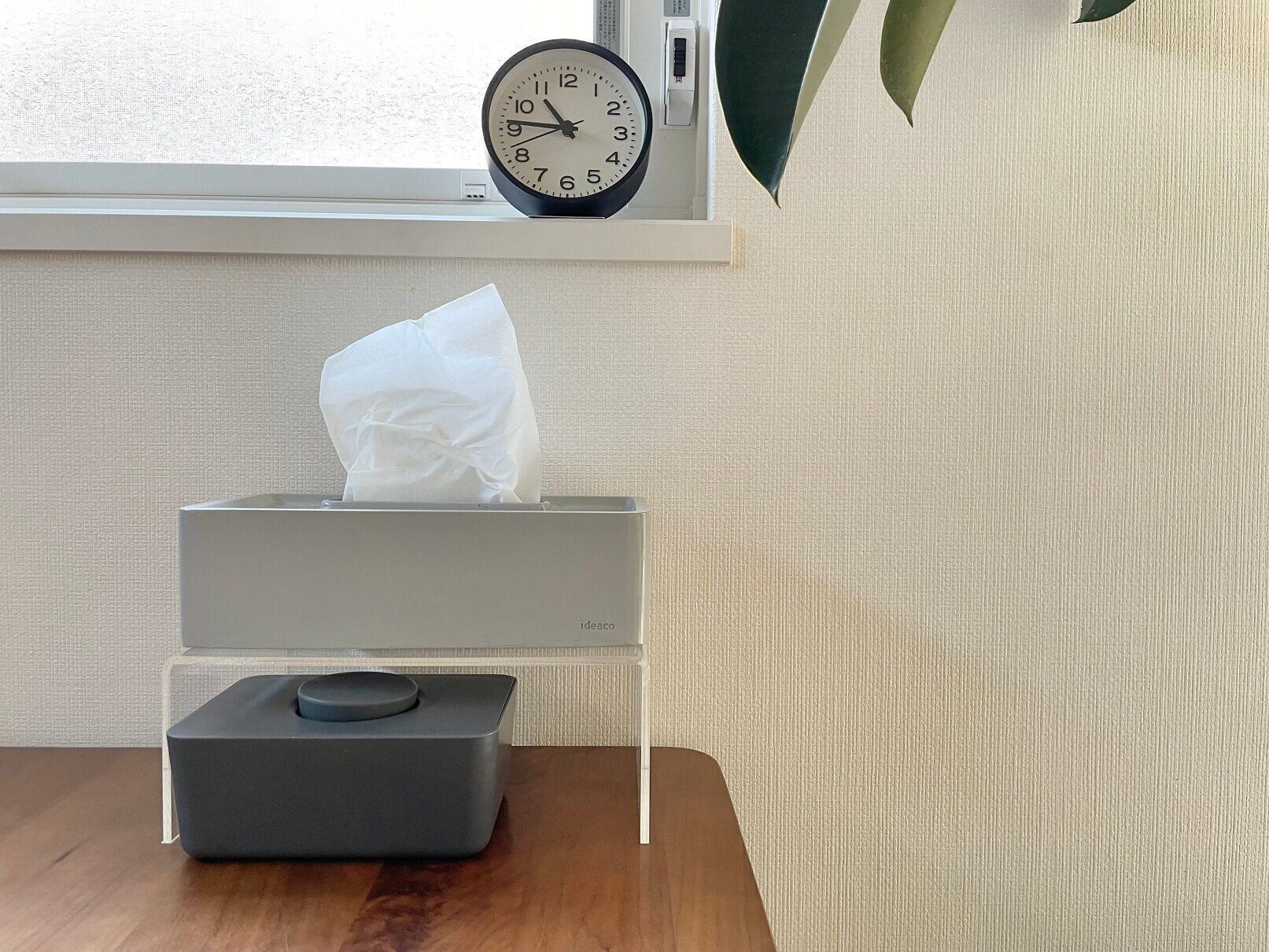 デスクカウンターやダイニングデスク上でも活躍します。今まで横並べにしていたウエットティッシュとティッシュケースですが、上下に配置にすることで省スペースになりました。デスクカウンターやテーブル上は、できるだけモノをスッキリさせると作業効率があがるので、アクリル仕切棚はテーブル上の整理にもおすすめですよ。