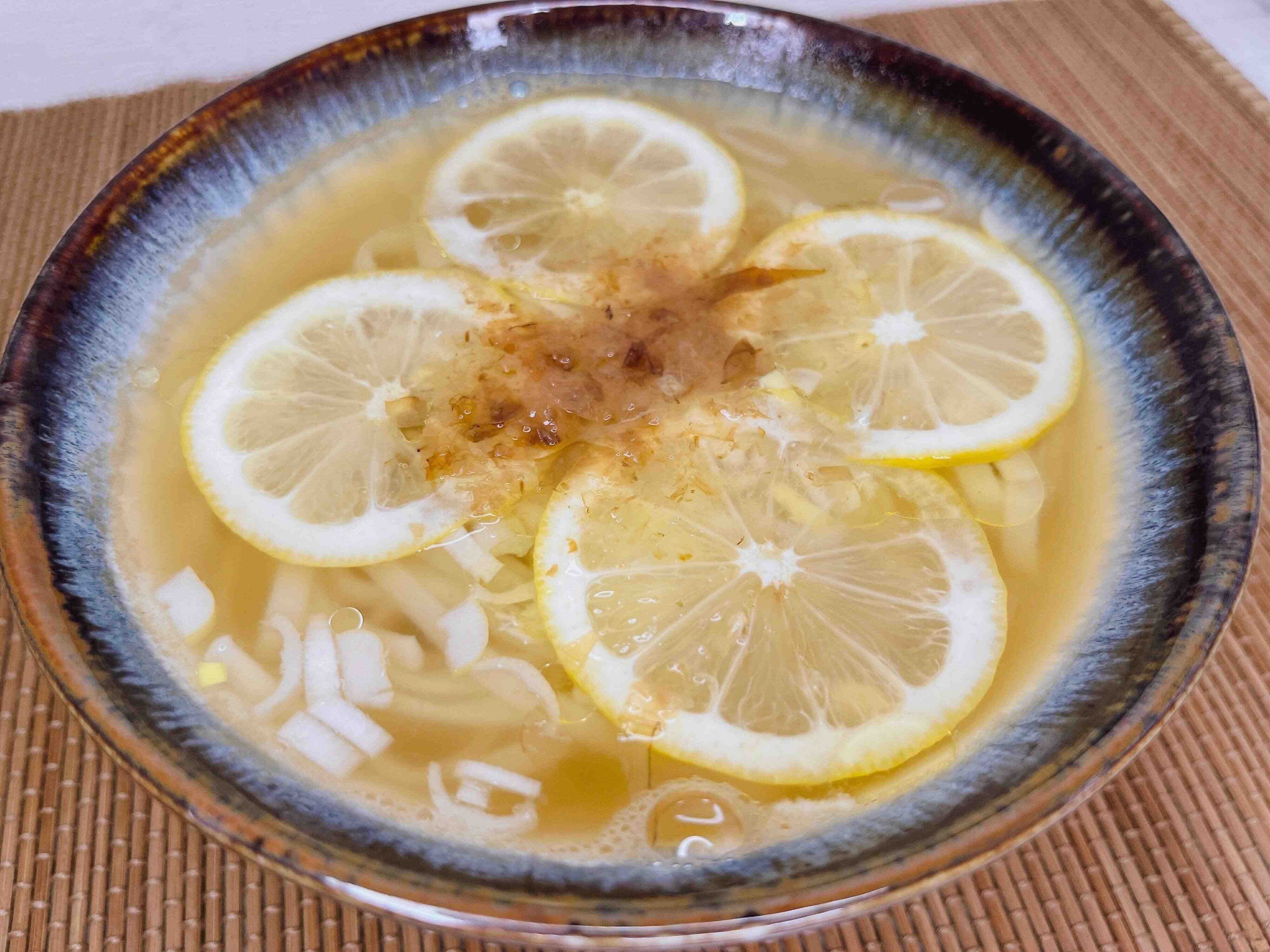 かぼすがなかったのでレモンの輪切りと、ネギ、鰹節をトッピングして頂きました。