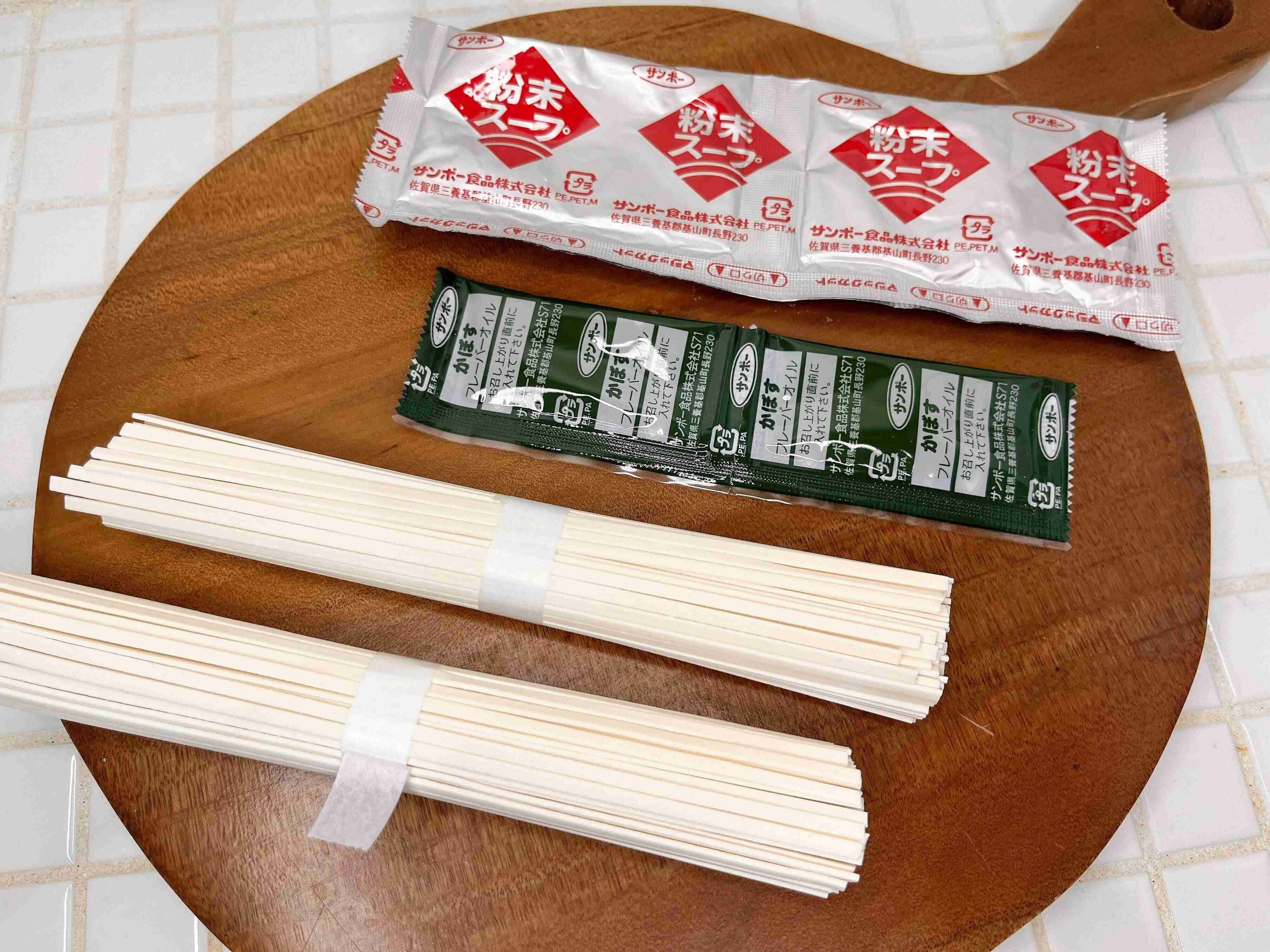 袋の中には乾麺、粉末スープ、かぼすフレーバーオイルが1人前×2セットずつ入っています。