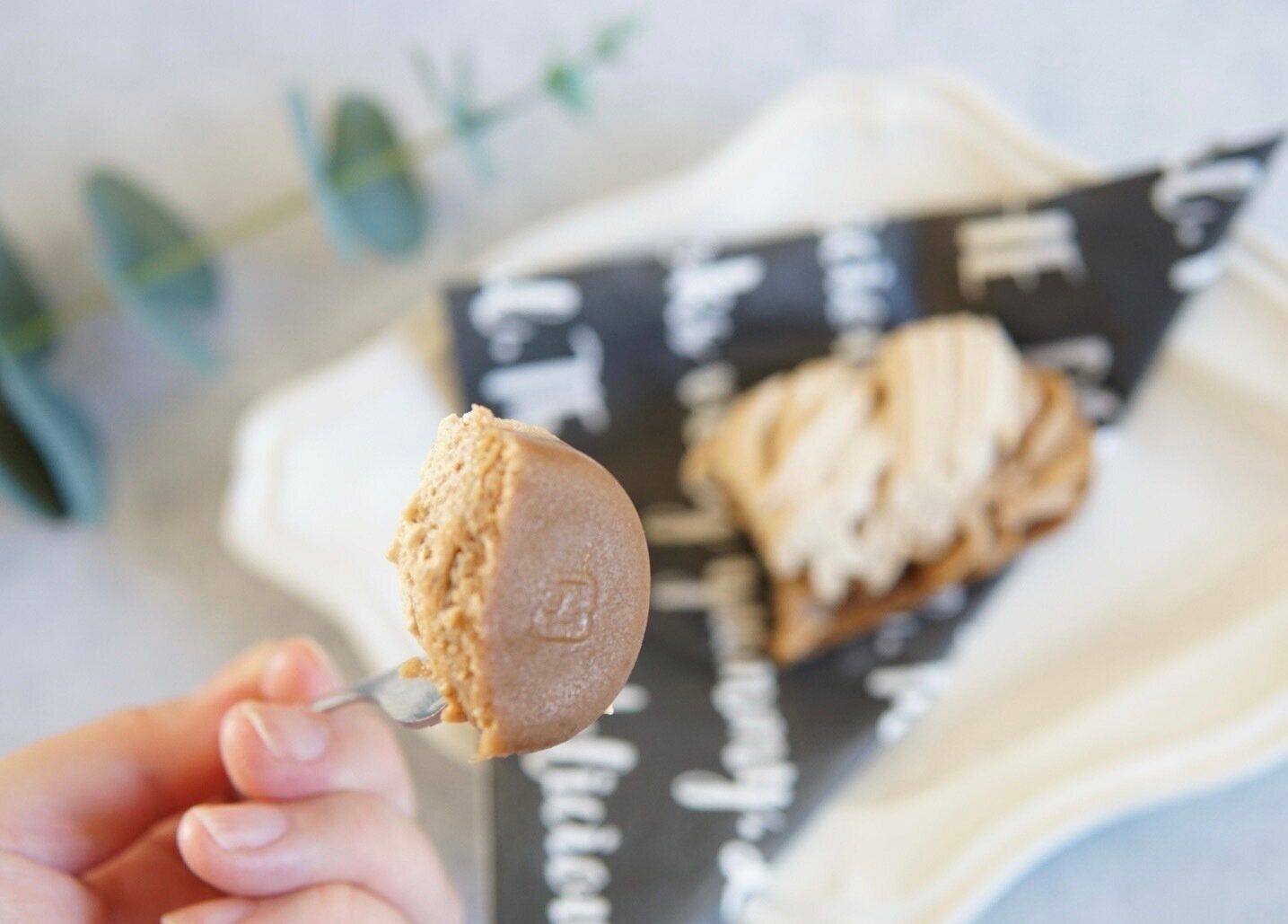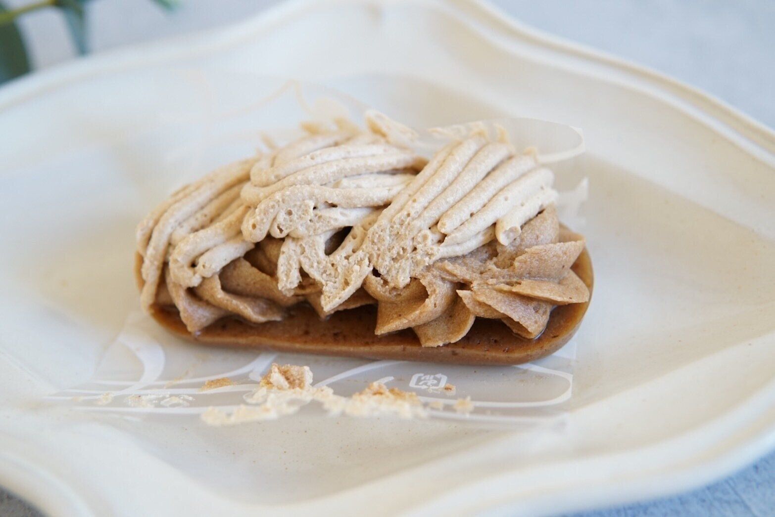 ・1番下の土台は、一見、しっとり系のクッキーやスポンジかのように見えますが、こちらも湯煎焼きをした焼きマロンクリームあんでした!モンブランに乗っている栗の甘露煮かなってくらい濃厚な栗感が感じられます。