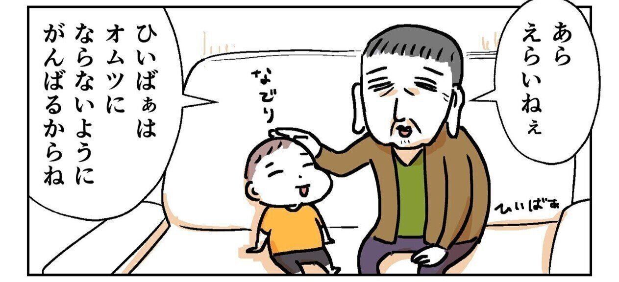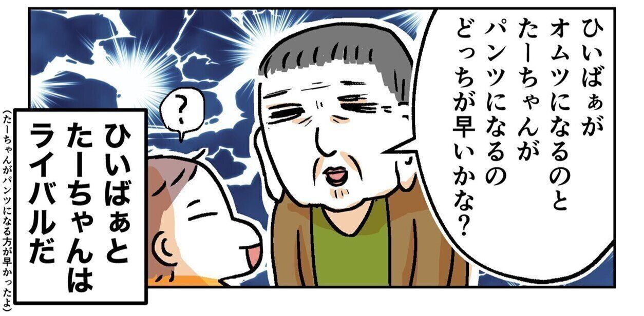 「ひいばぁがオムツになるのとたーちゃんがパンツになるのどっちが早いかな?」とライバル宣言!バトルを持ちかけるひいばぁさんがかわいらしいです。