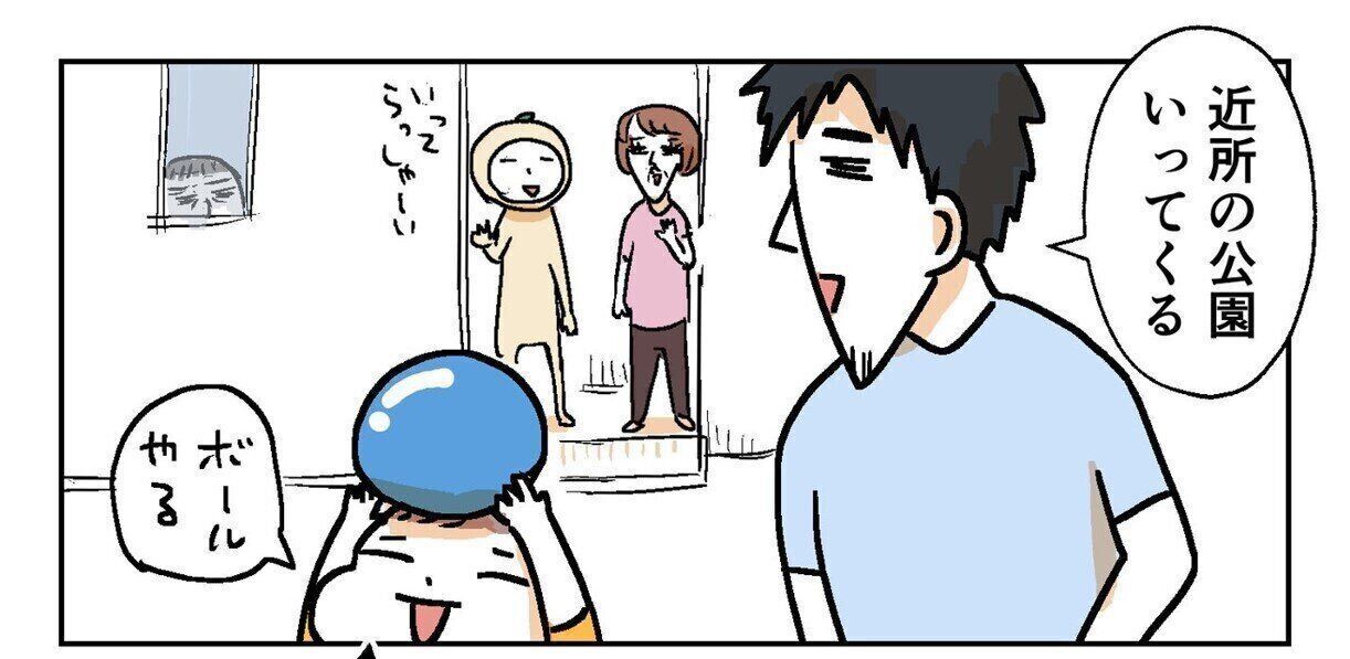 近所の公園へボールを持って出かけるパパとたーちゃん……と、その様子を窓から見ているひいばぁ。