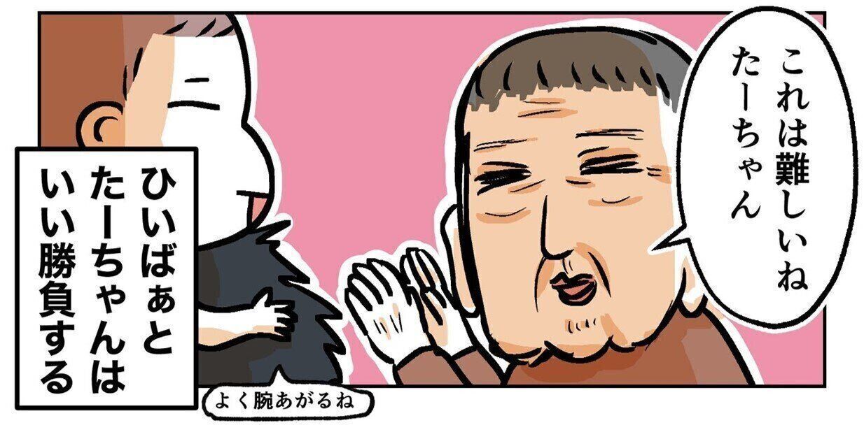 たーちゃんに対抗するひいばぁさんが面白くて、何度も読み返しました!漫画からは、たーちゃんに真剣勝負を挑んでいるようにも感じましたが、実際のところたーちゃんと張り合っているときのひいばぁさんは、どのような様子ですか?
