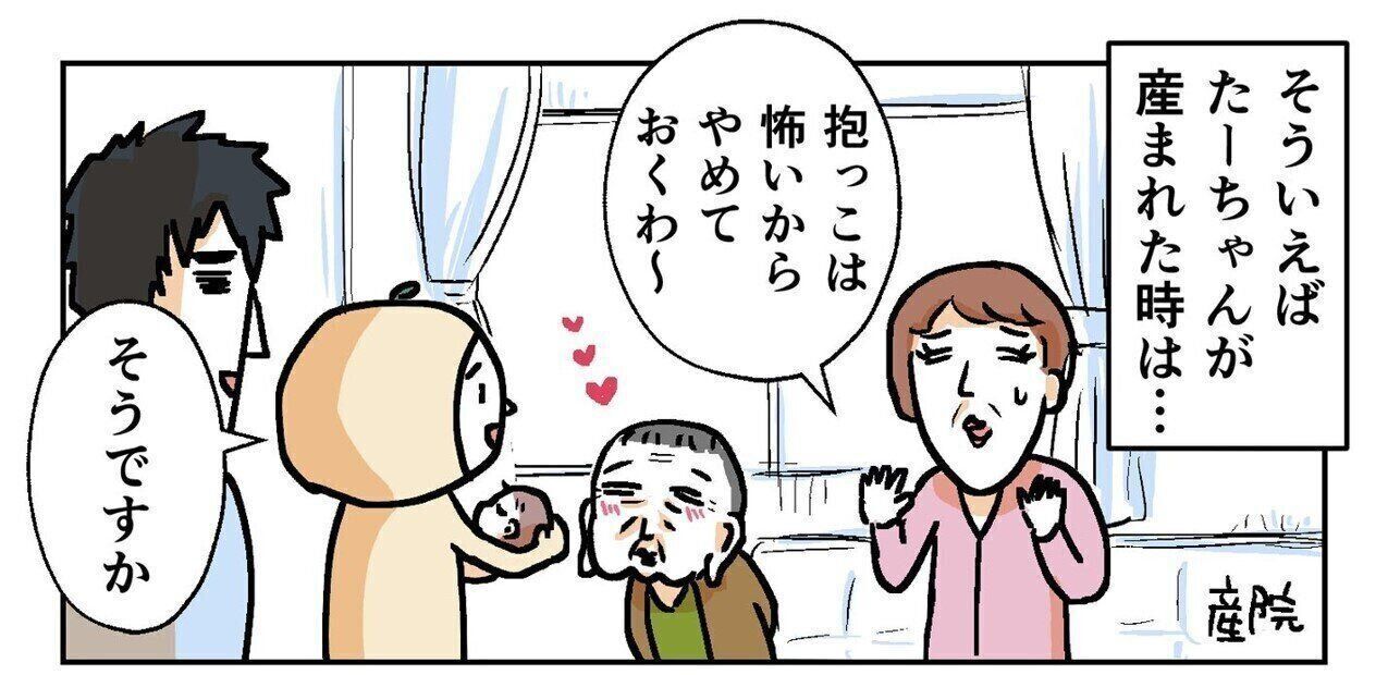 あかちゃんのたーちゃんを抱っこするひいばぁに、周りのほうが大慌て。産まれたときからたーちゃんを大事に思っているひいばぁさんにほっこりしますね。