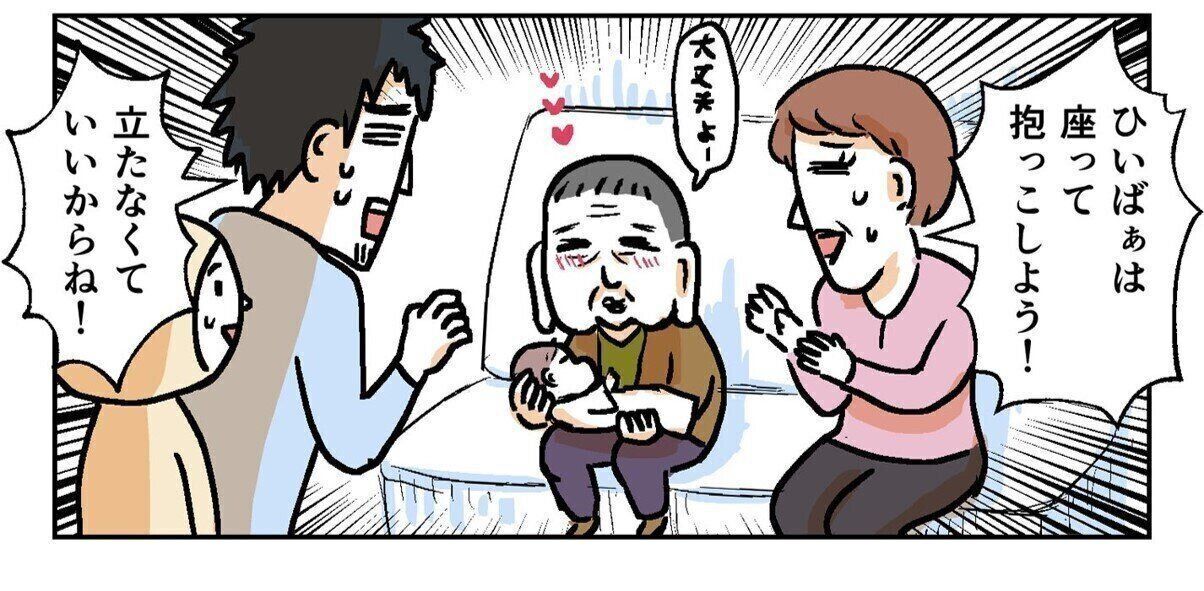 抱っこを遠慮したばぁばに対し、「ひいばぁは抱っこするよ」と申し出ます。