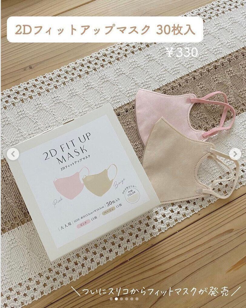 こちらは2Dフィットアップマスク。30枚入りで330円というコスパのよさにもびっくりですが、シルエットのよさや絶妙なカラーも人気の理由です。息がしやすく小顔効果も抜群!カラーは3種類あるようですが、店舗によっては売り切れになっているかもしれなので、早めにチェックしてみてくださいね。