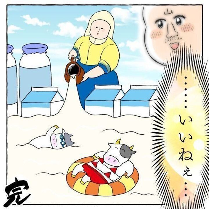 傘パワーでがんばって登園した息子さん。漫画の中の牛たちのように息子さんも牛乳のプールでゆったり過ごしたかったのかもしれませんね。牛乳への思いを華麗に切り替えたヤマモトさんの機転にも拍手です!
