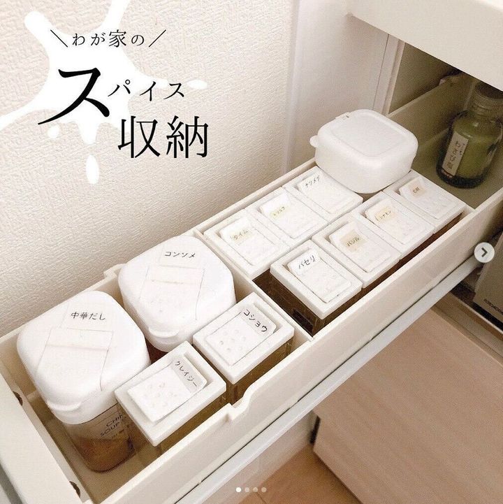 調理中はいろんなスパイスをパッと取り出して使いたいもの。スパイスは瓶の形もさまざまで、なんとなく置いておくとごちゃごちゃして見えてしまいますよね。そんなときはセリアで買えるスパイスボトルを使って、定位置を作ってあげましょう。見えやすい場所にラベリングするとさらに使いやすくなります。