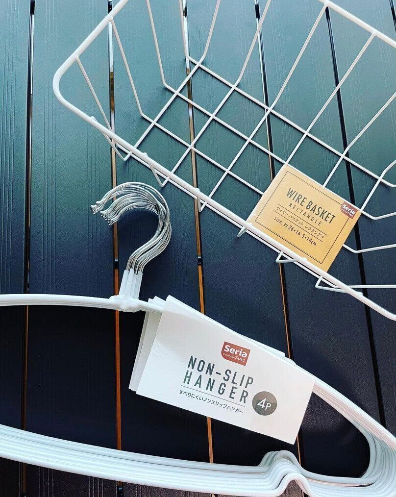 セリアの強みは、おしゃれさと、なんと言っても110円で買えること。右上のワイヤーバスケットはシンプルでいろんなものの収納に使えそうですね。左下は4本セットで110円というノンスリップハンガー。セリアで収納アイテムを探している方は、ぜひ参考にしてみては。