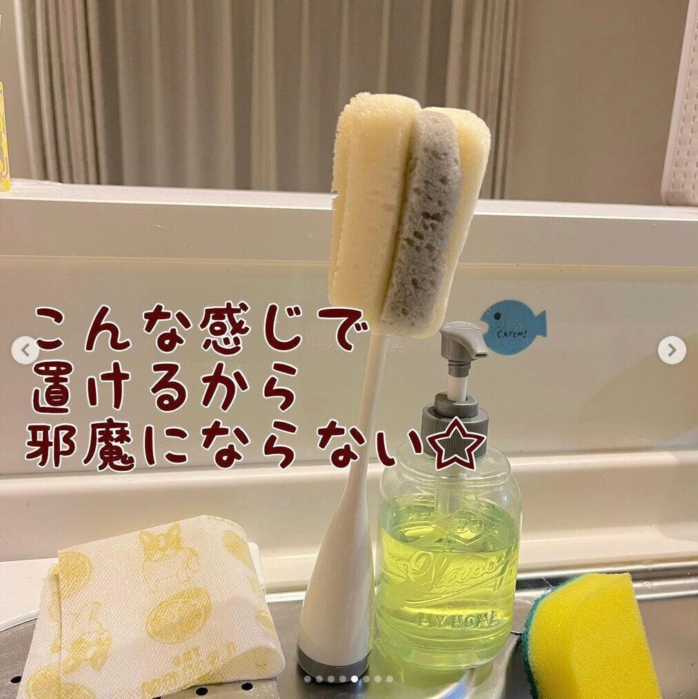 スポンジは使った後、しっかり水切りしたいもの。こちらはシンクで使ってみたいボトル洗いスポンジです。柄の部分に重りが入っていて、しっかり自立しますよ。引っ掛ける場所や置く場所がなくて困っていた方におすすめです。