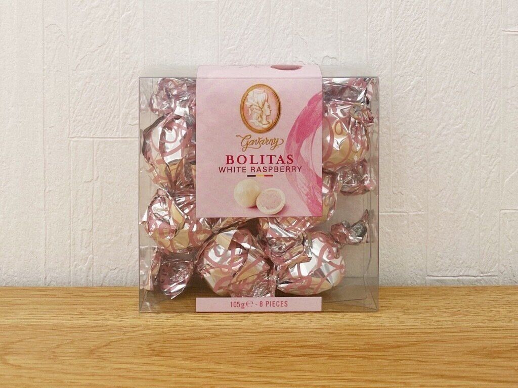 ひとくちでパクっと食べられるサイズ感。コーティングのホワイトチョコレートはかための食感で、なめらかなラズベリーフィリングとの食感の違いを楽しめます。ミルキーで甘いホワイトチョコレートと甘酸っぱいラズベリーは相性がよく、口の中で混ざり合うと絶妙な味わい。同シリーズで「ミルク」や「ダーク」も販売されています。