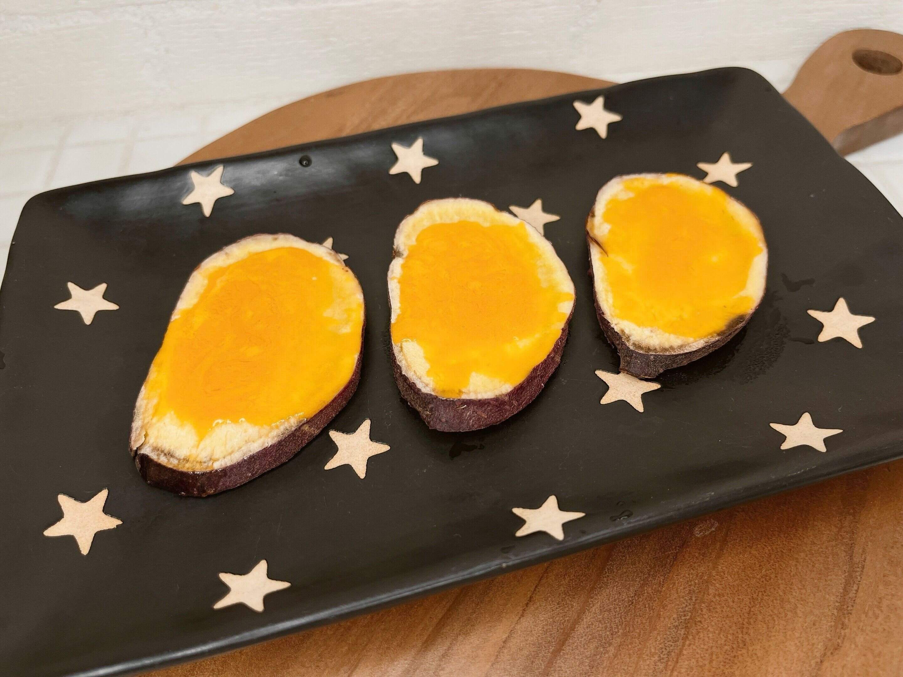 さつまいもを薄めにスライスして、その上にうにバターをのせ、電子レンジで加熱します。