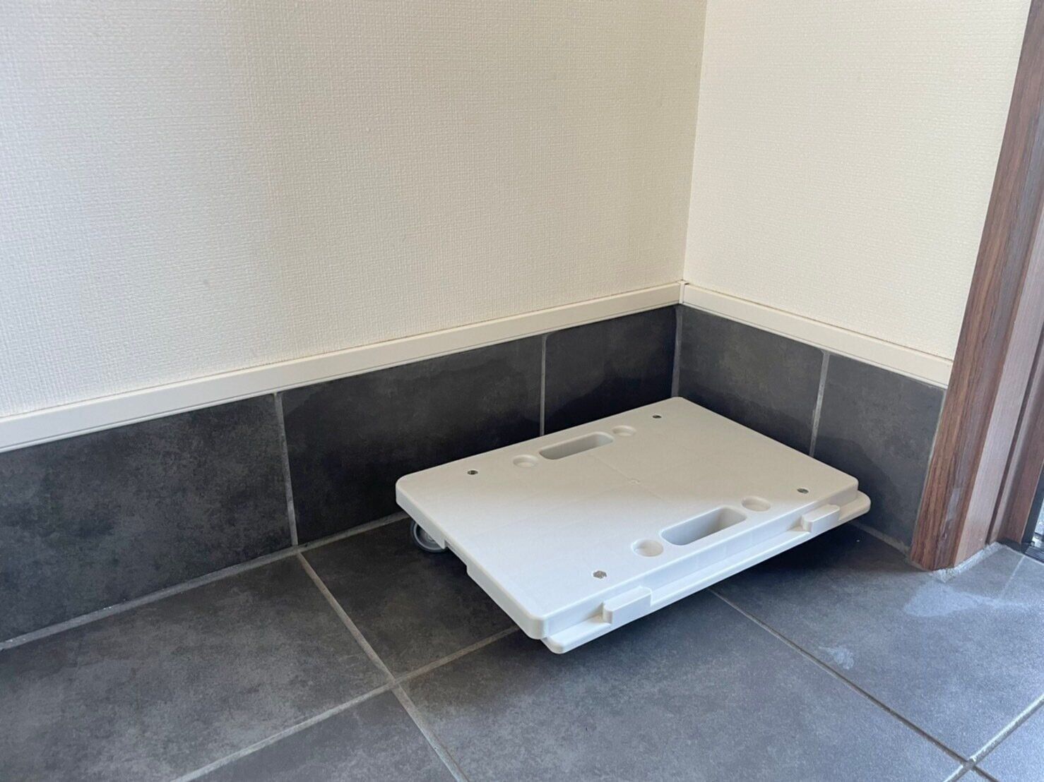 宅配スーパーのボックスなど、どうしてもたたきに置かなければならない場合は、キャスター付きの台車を利用すると、玄関掃除も楽にできますよ。我が家では無印良品の「縦にも横にも連結できるポリプロピレン平台車」を使っています。