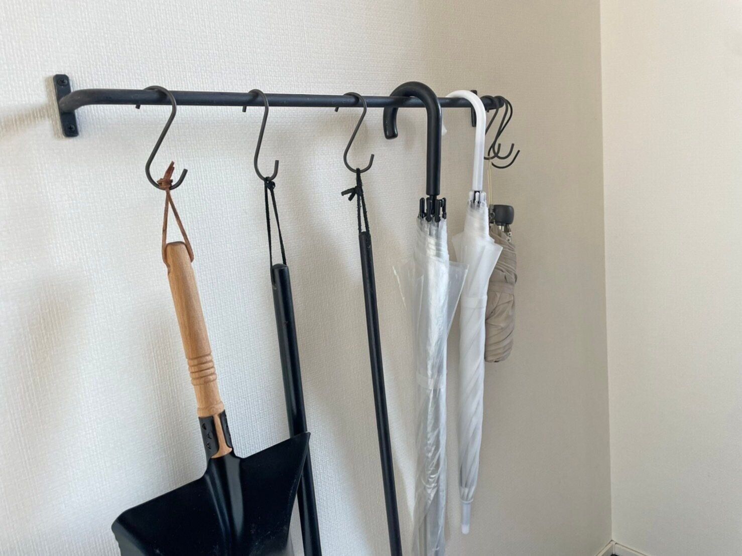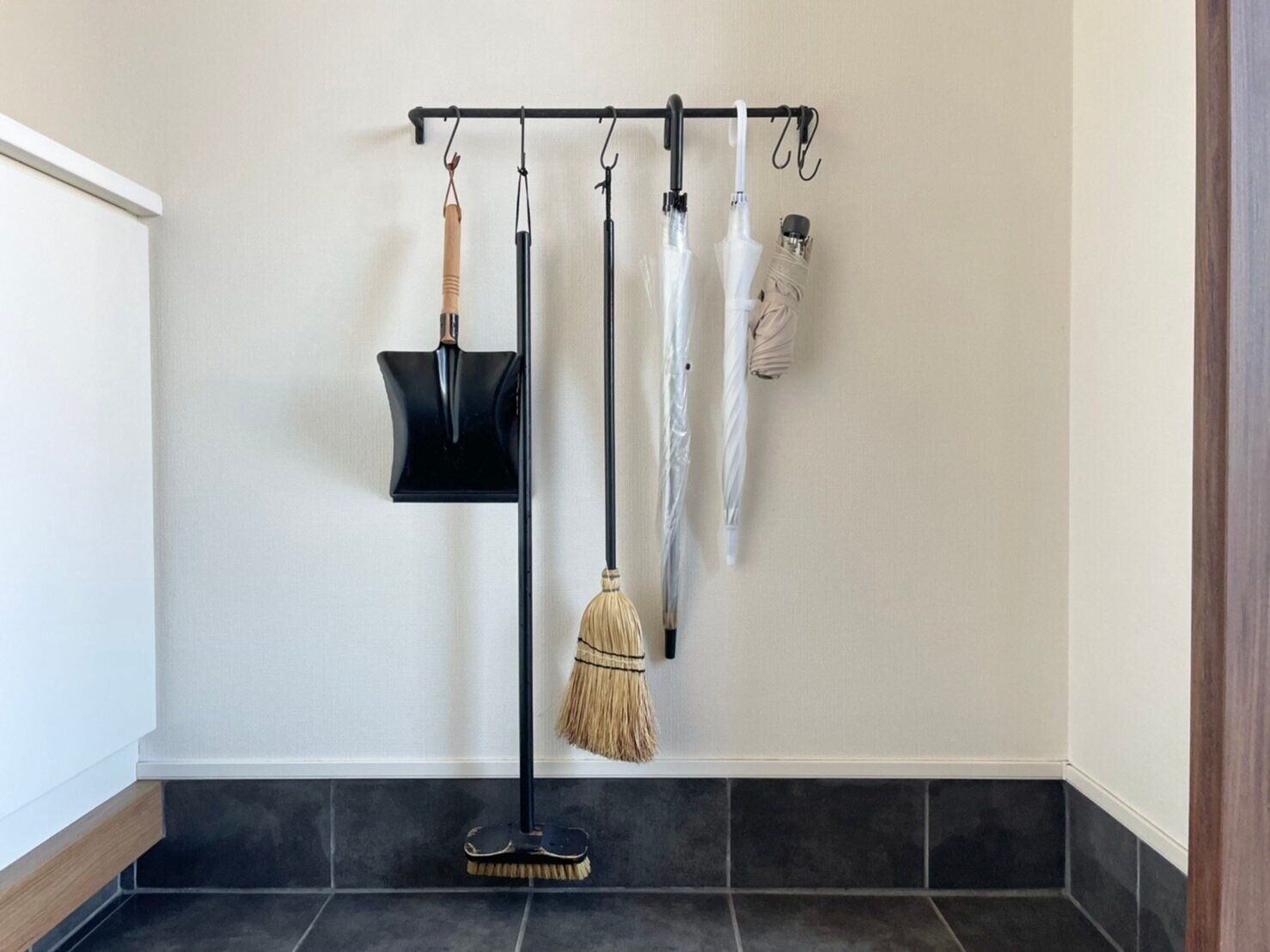 既存の住宅の方は、玄関土間の余白がある壁にハンガーパイプをつけ、そこに乾いた傘を掛けるようにすると、たたきがとてもスッキリします。