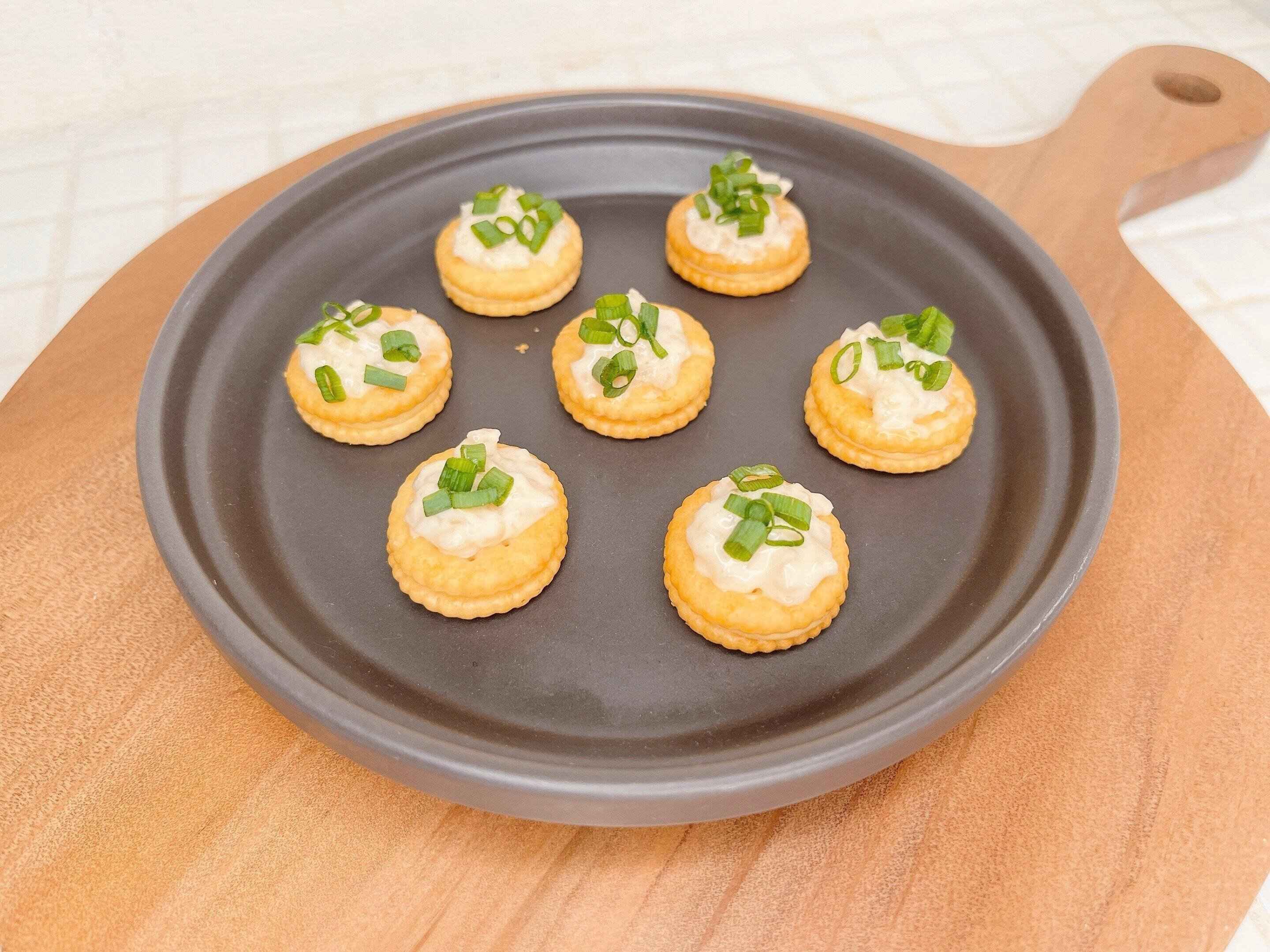 カルディのいぶりがっこのタルタルソースはご飯やパン、揚げ物などにはもちろん合いますが、お酒のおつまみとしても最高な商品です。クラッカーにいぶりがっこのタルタルソースをのせ、その上に小ねぎをトッピングするだけで完成!