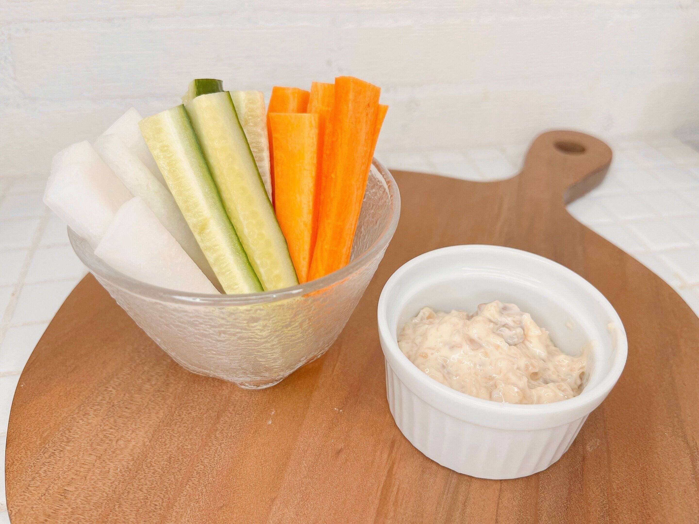 まずは基本的な食べ方、野菜スティックをディップして食べる食べ方です。スティック状に食べやすくカットしたきゅうり、にんじん、大根などの野菜に、いぶりがっこのタルタルソースをたっぷりディップして食べます。