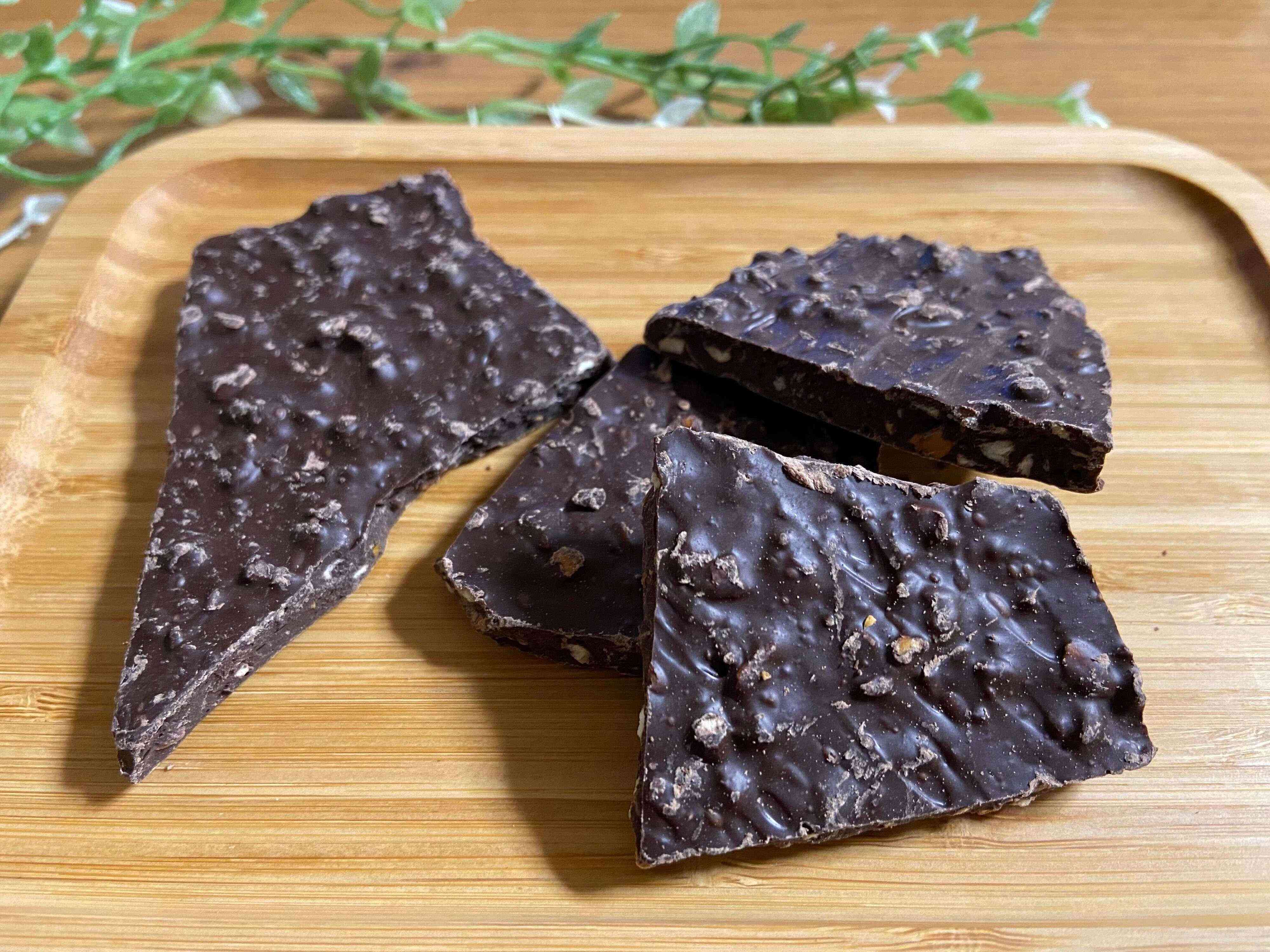 店頭に並んでいて「塩がアクセント」のワードに惹かれて購入してみました。チョコレートに砕いたプレッツェルとシーソルトを練り込んであるとのこと。大きさは割れチョコのように大小さまざまです。