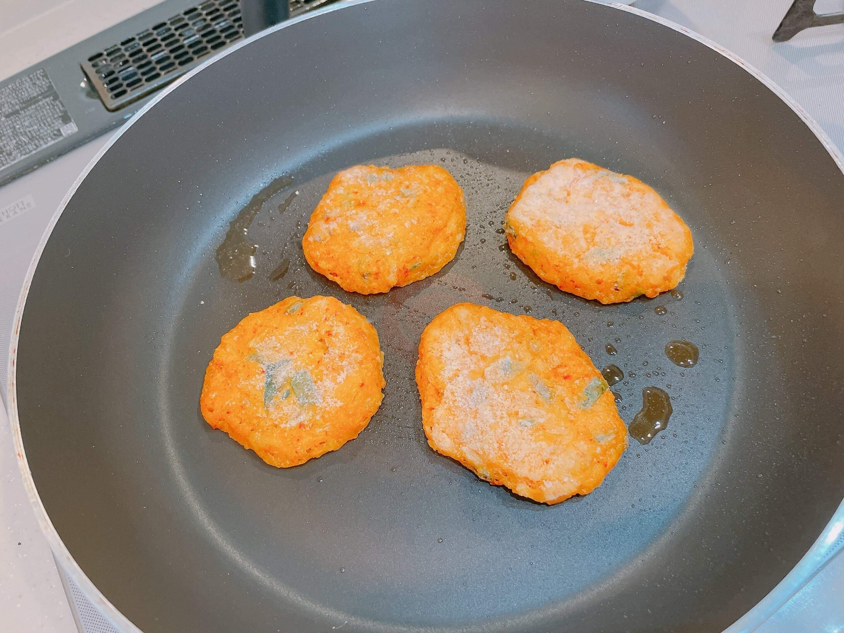 トースター8分でもできあがりますが、わが家の定番はごま油を熱したフライパンにキムチチヂミを入れ、両面それぞれ2分焼いて表面をカリっとさせるつくりかたです。
