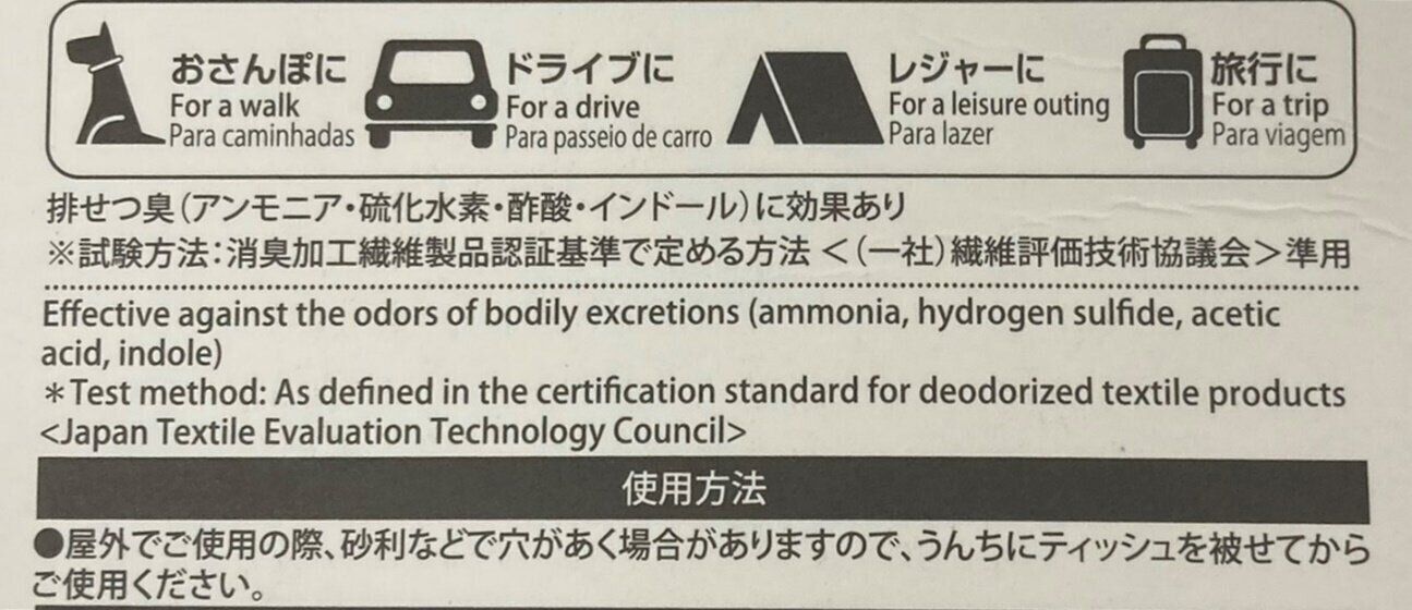 消臭成分が入っているということは、ワンちゃんのお散歩にぴったりじゃん!と思ったら、パッケージ裏の説明に書いていました(笑)。