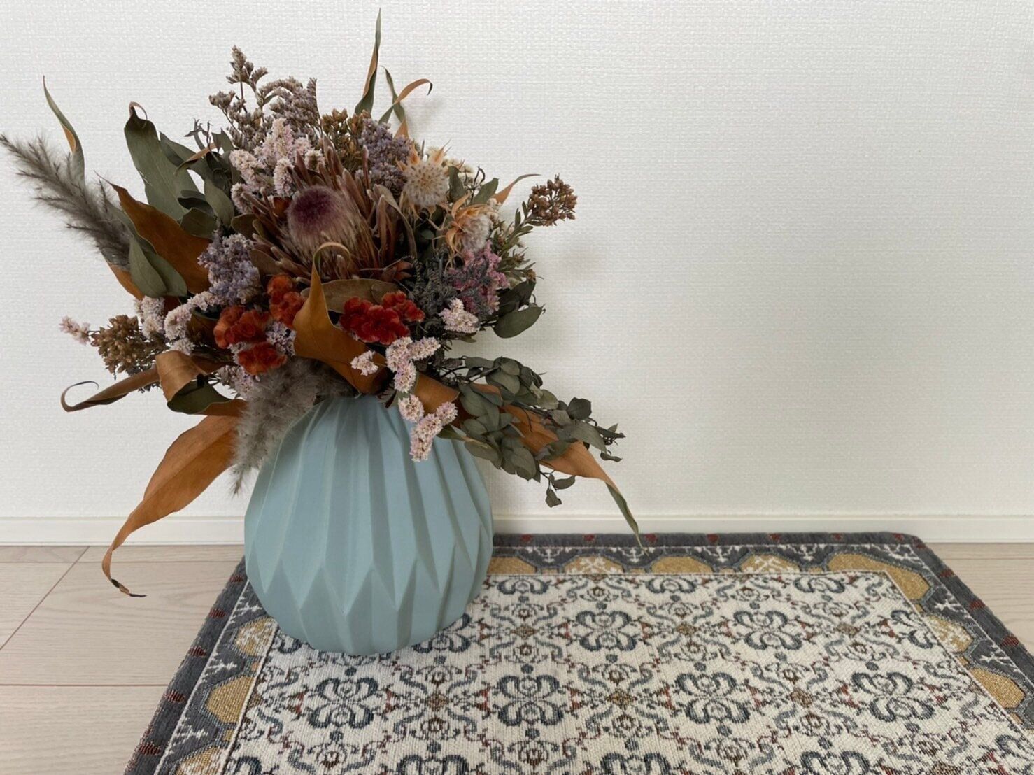 アンティークマットは、ドライフラワーとの相性が抜群。写真のドライフラワーの色目は鮮やかですが、シンプルなドライフラワーの場合でも3CIOINSのアンティークマットと置くことで、さらに素敵なインテリア空間に映えますよ。