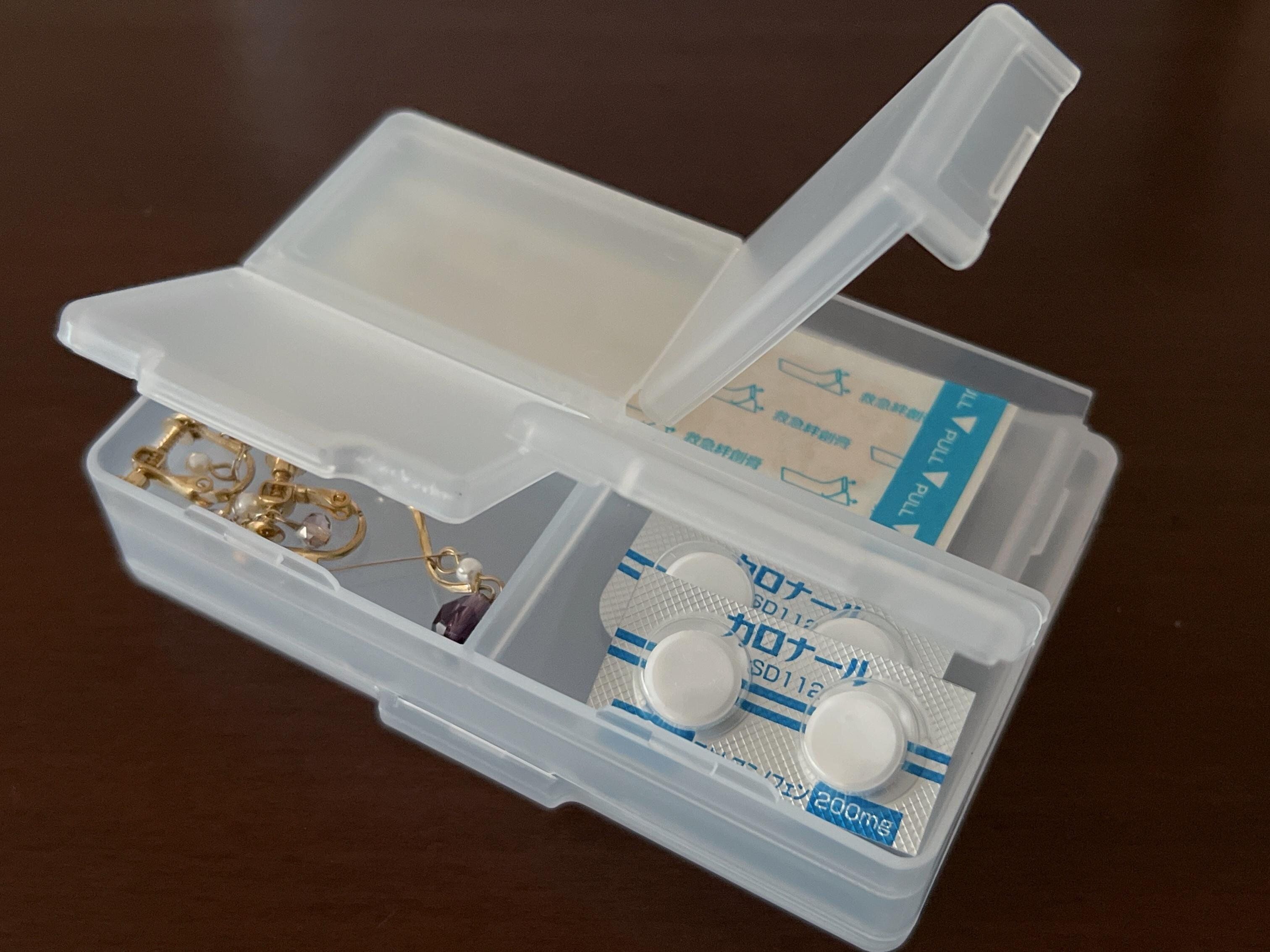 さらに小さいポケットには薬やアクセサリーを入れました。常備薬など「これだけは必ず持ち歩かないと落ち着ない!」といったお出かけに必要な小物をこのケースに収めていれば、バッグの移し替えもラクです。