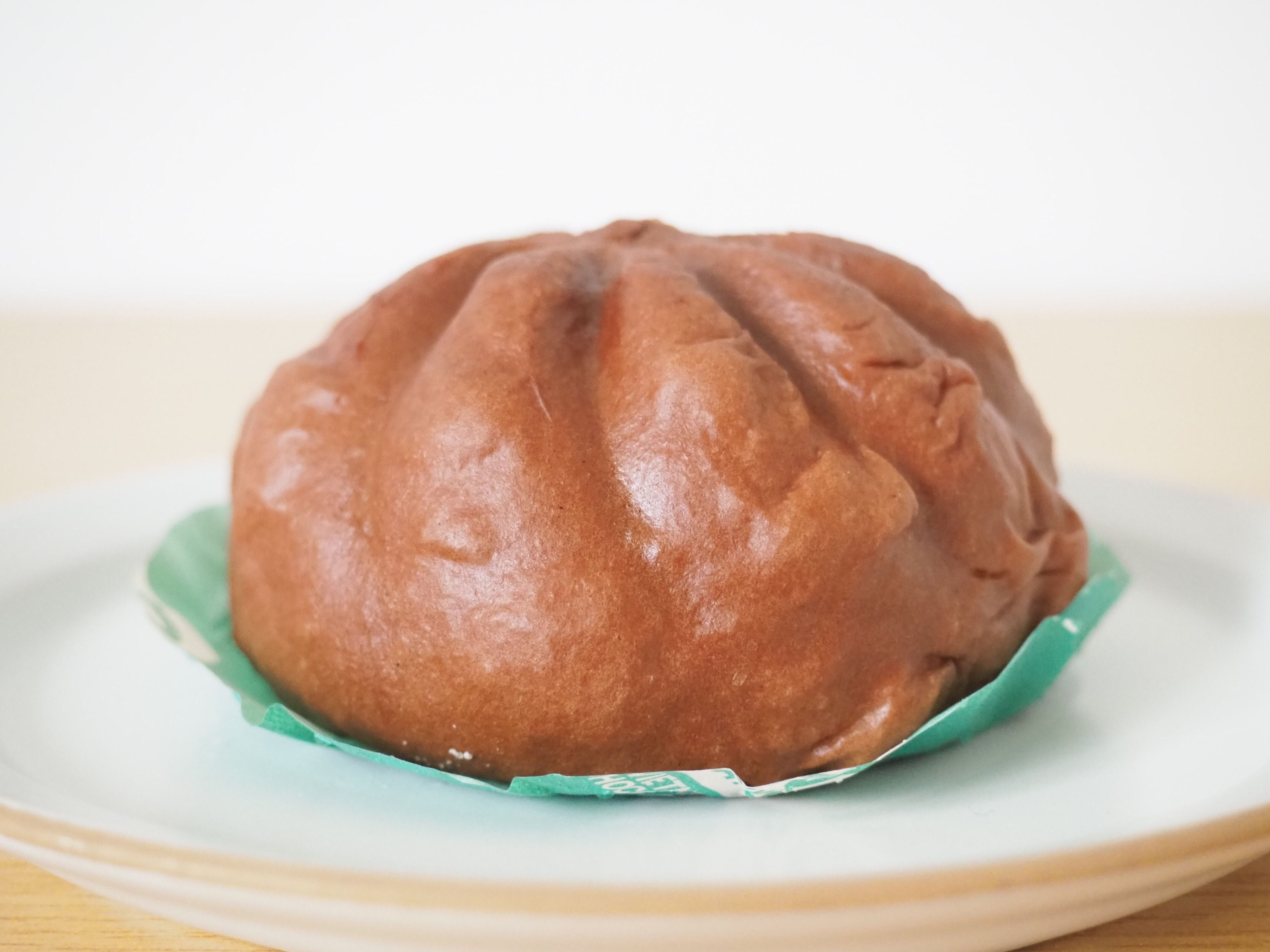 取り出してみると現れるのは茶色い中華まん。ドームの頂点をつまんでひねったような形をしています。