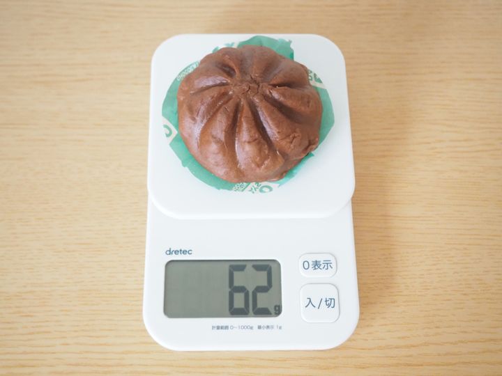 重さを計ってみたところ62gでした。大きさは幅約6.5cm×厚さ約4cmなので、一般的な中華まんより少し小ぶりなようです。