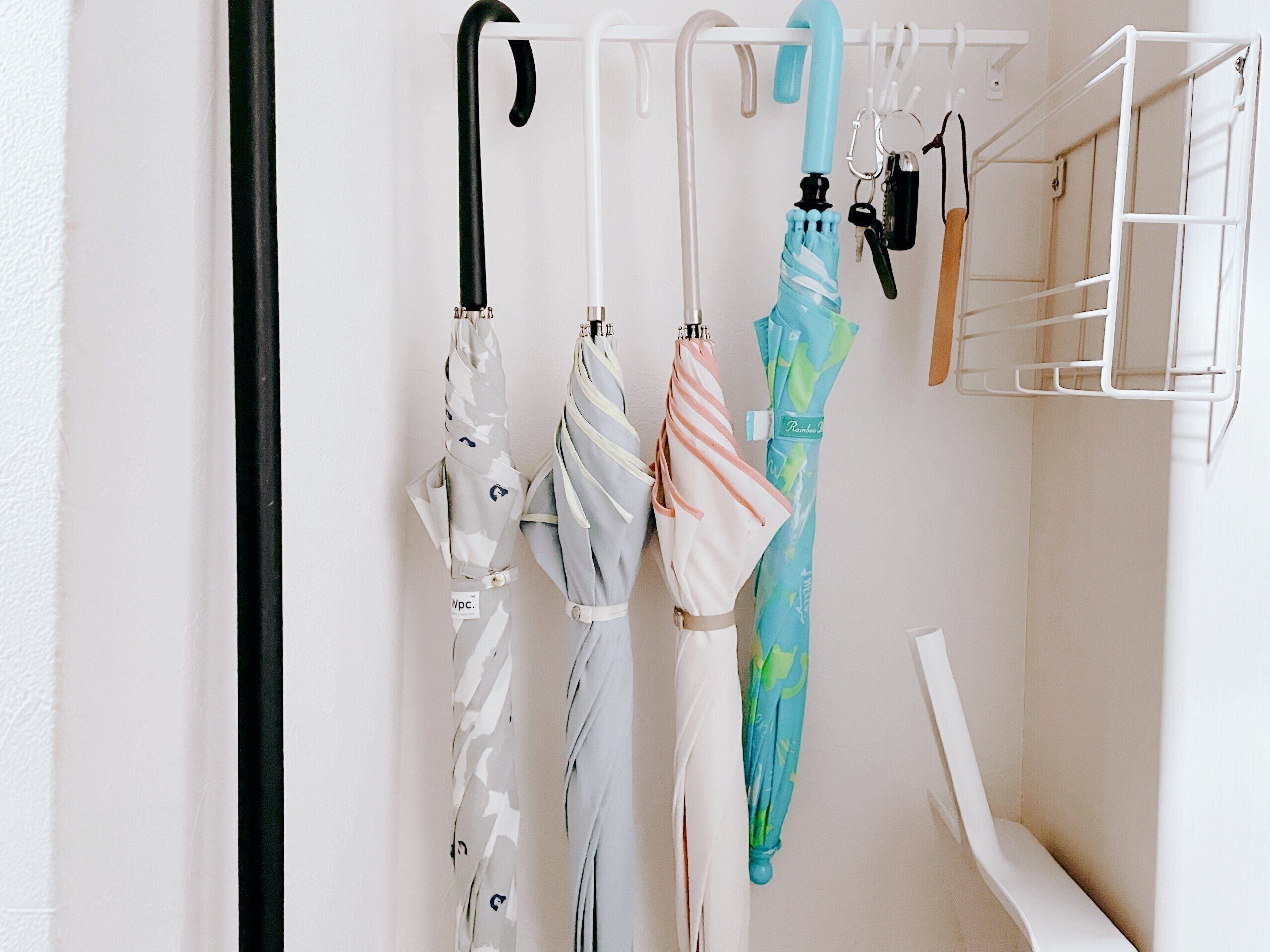 釘を使って設置するのに抵抗がある場合は、突っ張り棒を使う方法も!最近では突っ張り棒の落下防止グッズもたくさん販売されているのでしっかりとした収納を作ることができます。また傘の本数が2本以下なのであれば、玄関扉にくっつくマグネットタイプの傘立ても便利です。