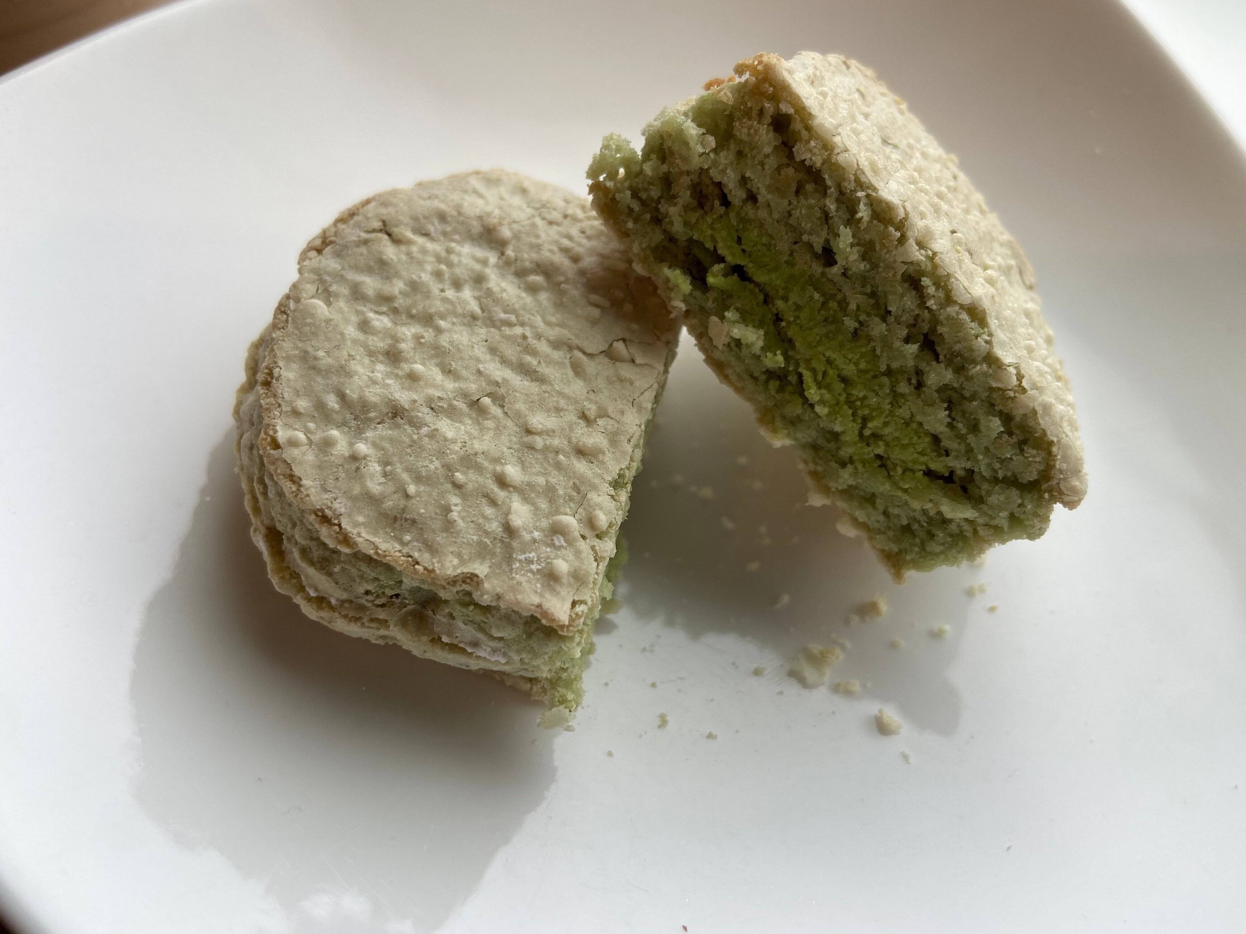 ピスタチオの独特の風味がダックワーズのフワフワでもちもちの生地によく合い、おいしい癒しされタイムです。