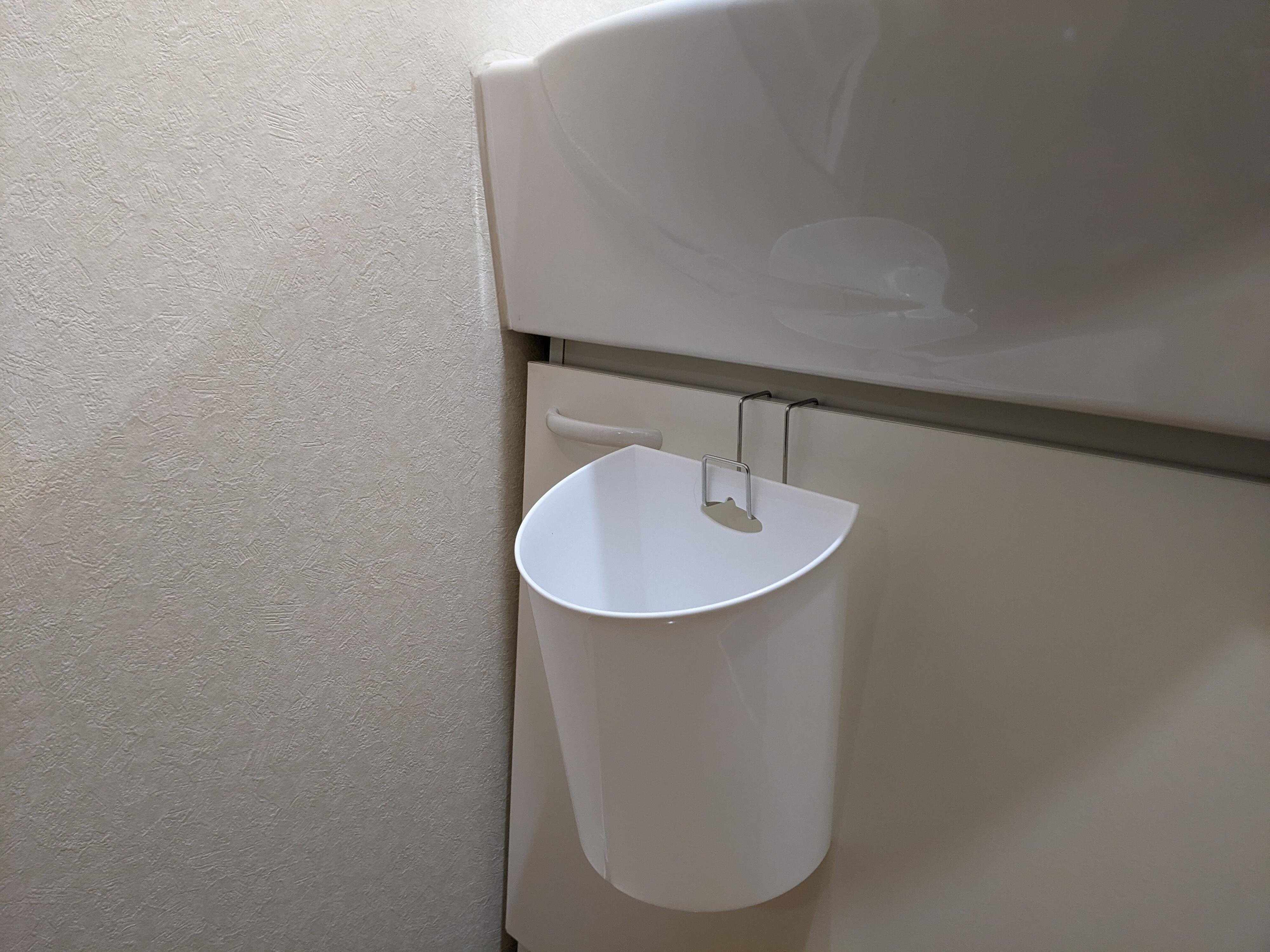 洗面所でゴミ箱をかけておけば、排水口の髪の毛などのゴミをその場で捨てられて便利です。