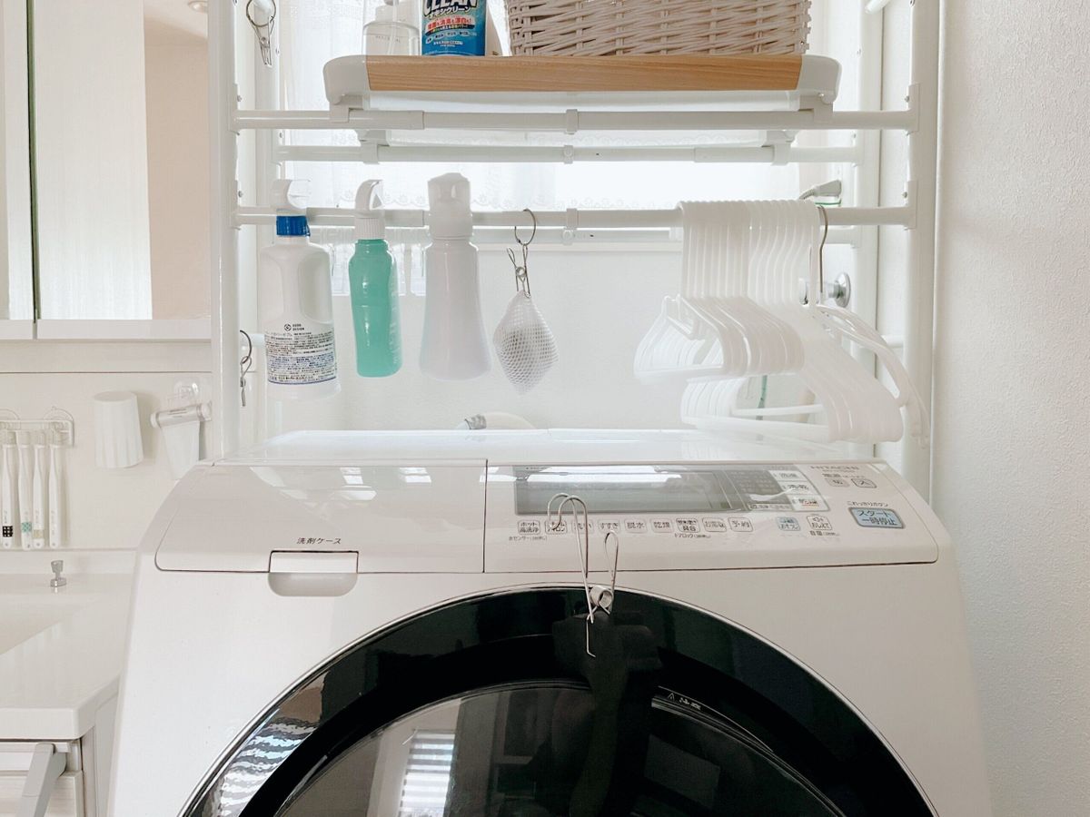 洗濯カゴを干す場所に運んでから洗濯物を干すのは実は時間ロス。洗濯機から洗濯物を出しながらハンガーがけしていくのが1番時間ロスが少ないんです。洗濯機のまわりにハンガーやピンチハンガーなど必要なものをすべてそろえておけばムダな動きがなく、干す場所も天候やその日の予定に合わせて変えることができます。