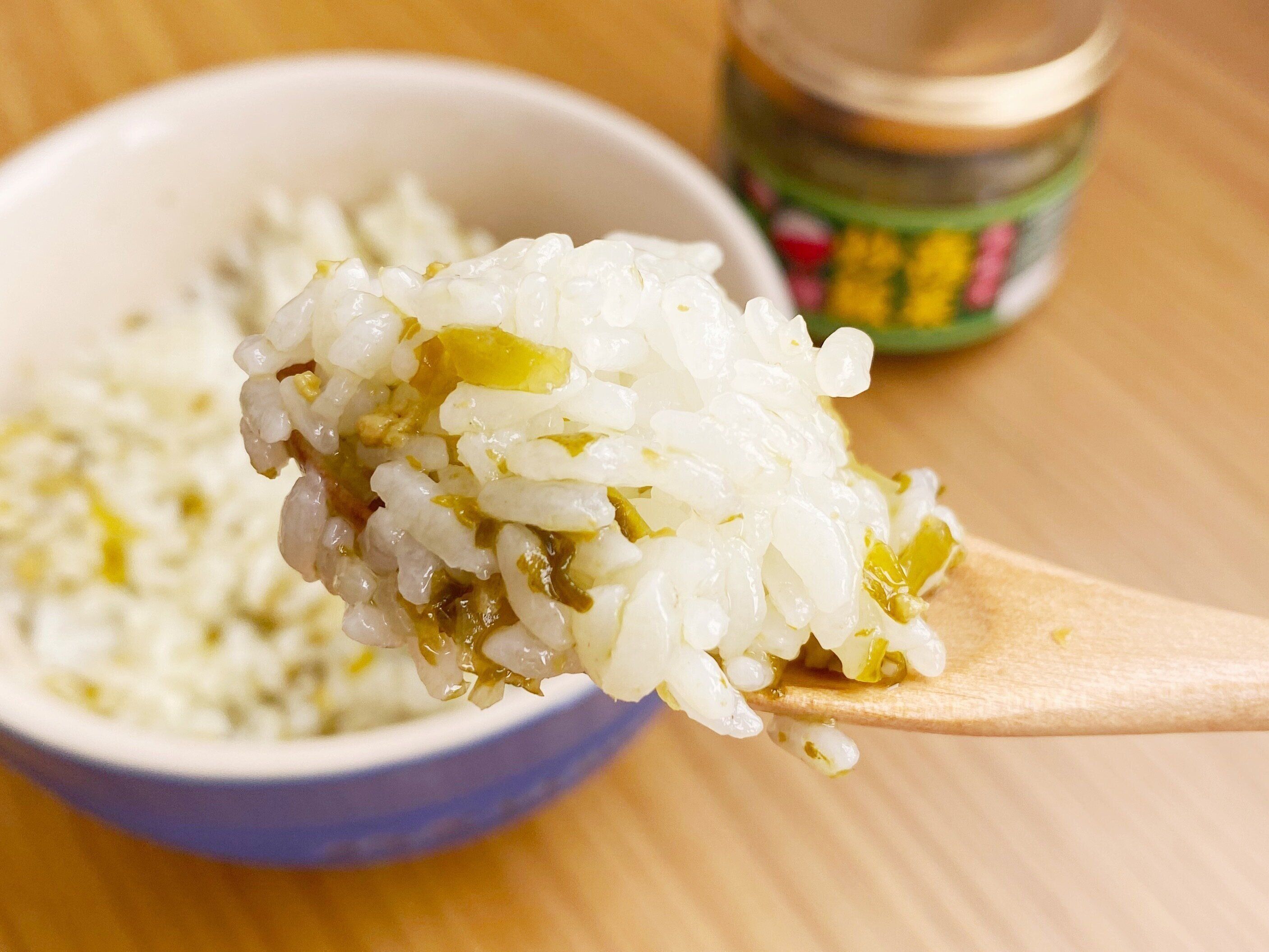 混ぜ合わせると、見た目は高菜の混ぜご飯のようですが、口に入るとしっかり炒飯の味がして驚き。