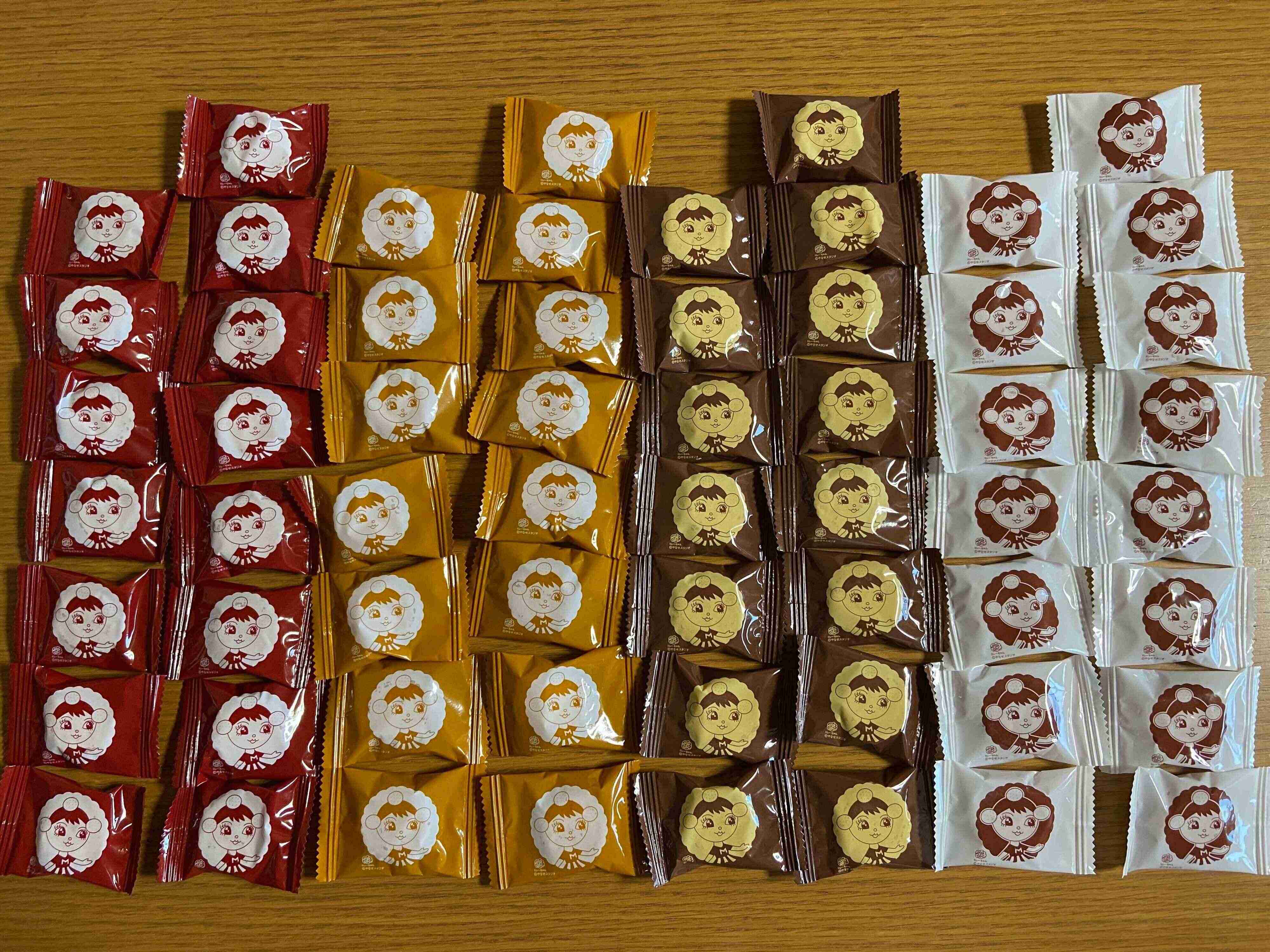 箱の中身をすべて並べてみました。4種のミレーサンドがそれぞれ15個入りで計60個!個包装になっていてマスコットの「ミレーちゃん」がかわいらしいですね。