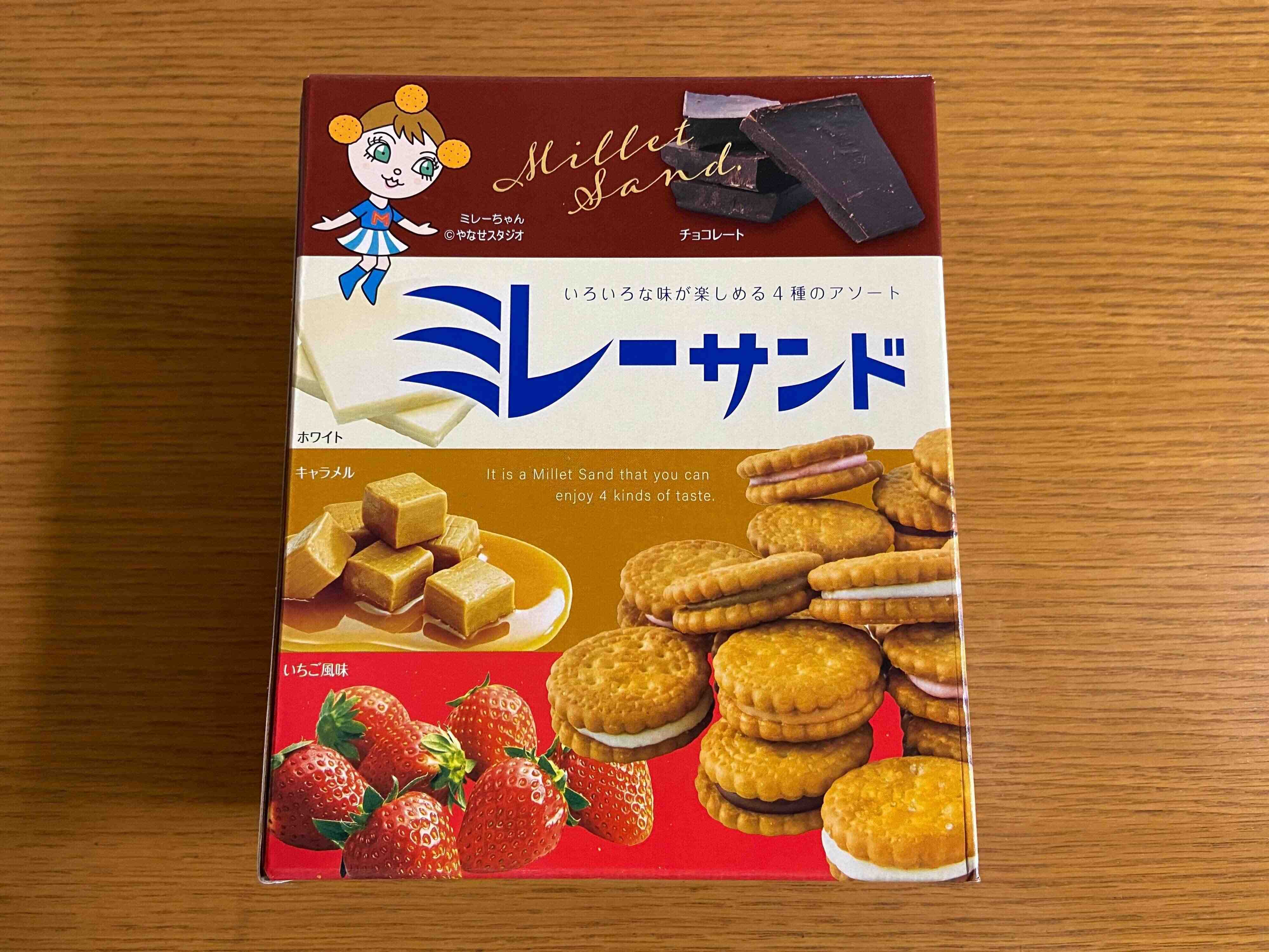 ミレービスケットは高知県のご当地お菓子で、野村煎豆加工店が製造しています。揚げたビスケットの甘さとしょっぱさが絶妙なファンも多いお菓子。そのミレービスケットに高知の洋菓子店モンプレジールの特製クリームをサンドしたのが、ミレーサンド。共同開発商品なんだそう。