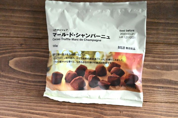 無印良品のカカオトリュフ「マール・ド・シャンパーニュ」は、フランス・シャンパーニュ地方産のぶどう由来の蒸留酒で、ブランデーの一種である「マール」が練り込まれていいます。