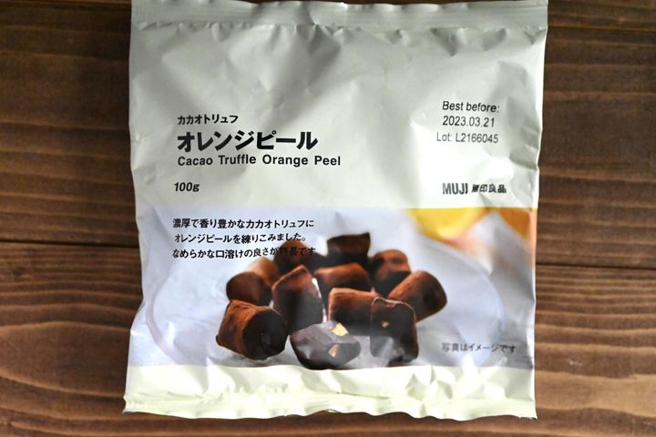 無印良品のカカオトリュフ「オレンジピール」は濃厚なチョコレートに、オレンジピールが練りこまれています。