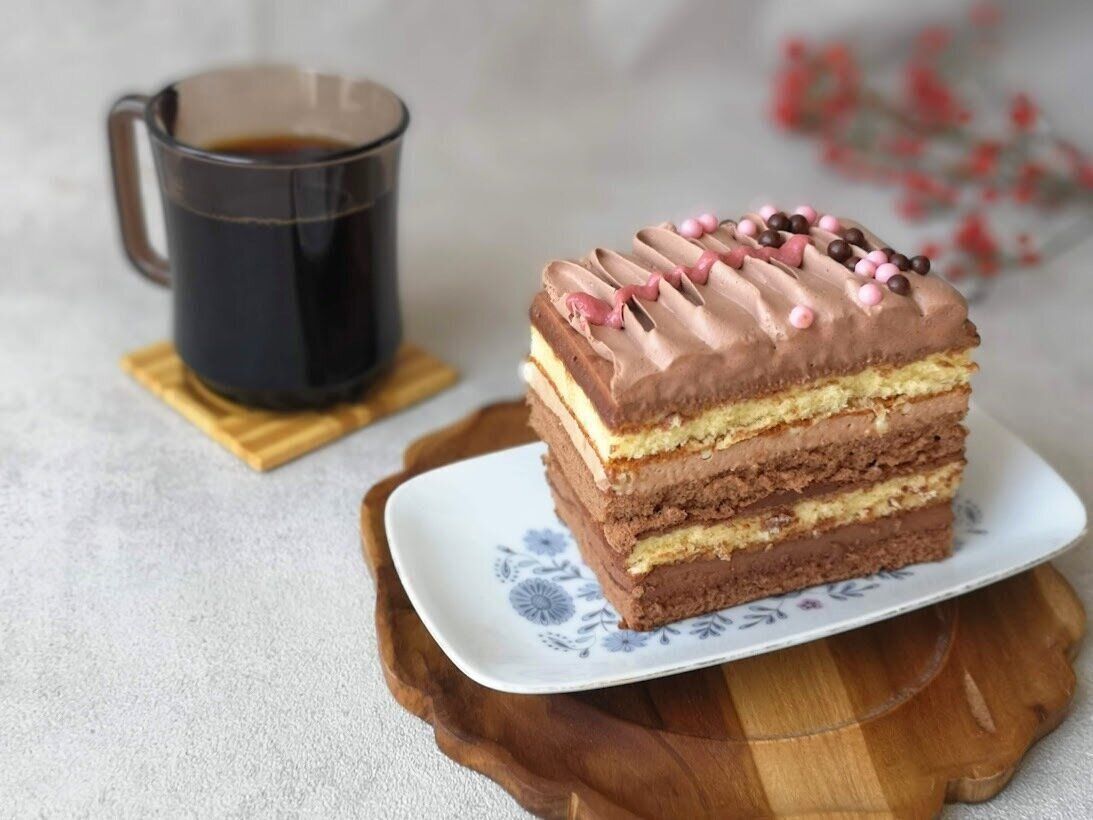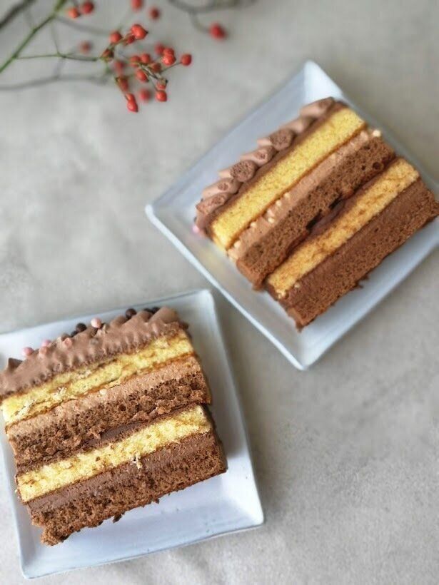 ケーキを細かく見てみると、上から、チョコレートムースクリーム、パフ、ベリー系のチョコレートソース、スポンジ、生チョコのようなクリーム、ココアスポンジ、ガナッシュクリームと、かなりバラエティに富んだ層が重なっています。