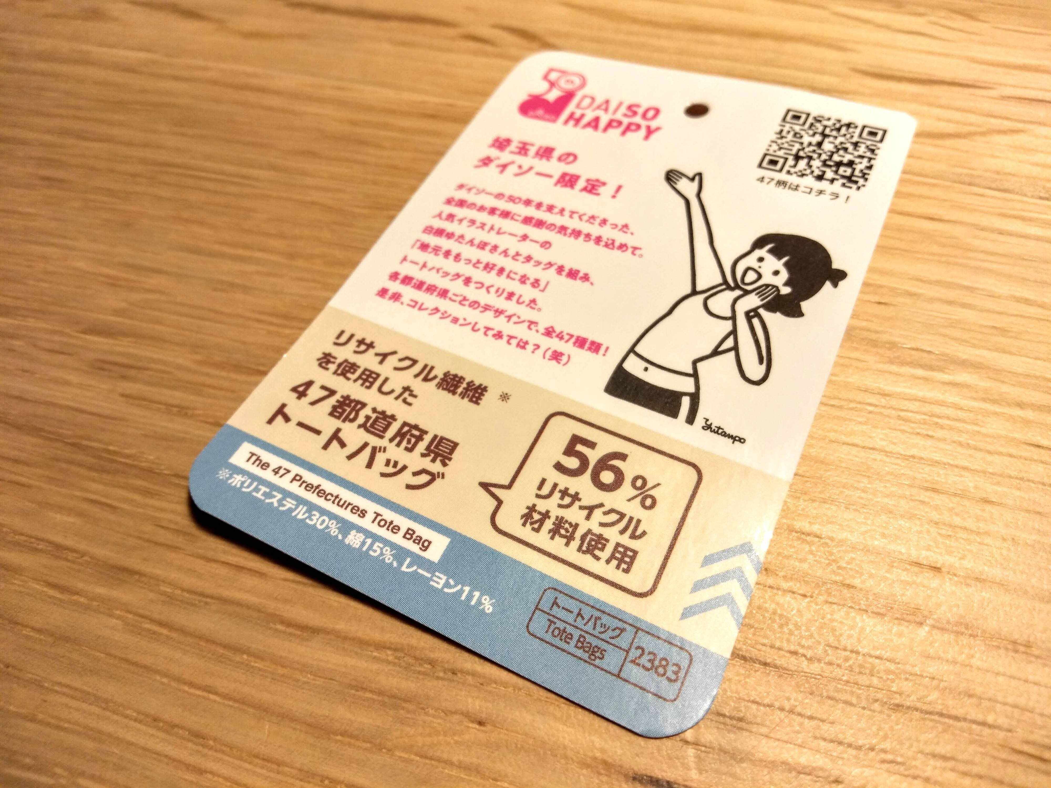 こちらのトートバッグ、47都道府県で全て絵柄が異なりますが、それぞれの都道府県のダイソーでしか入手できません。