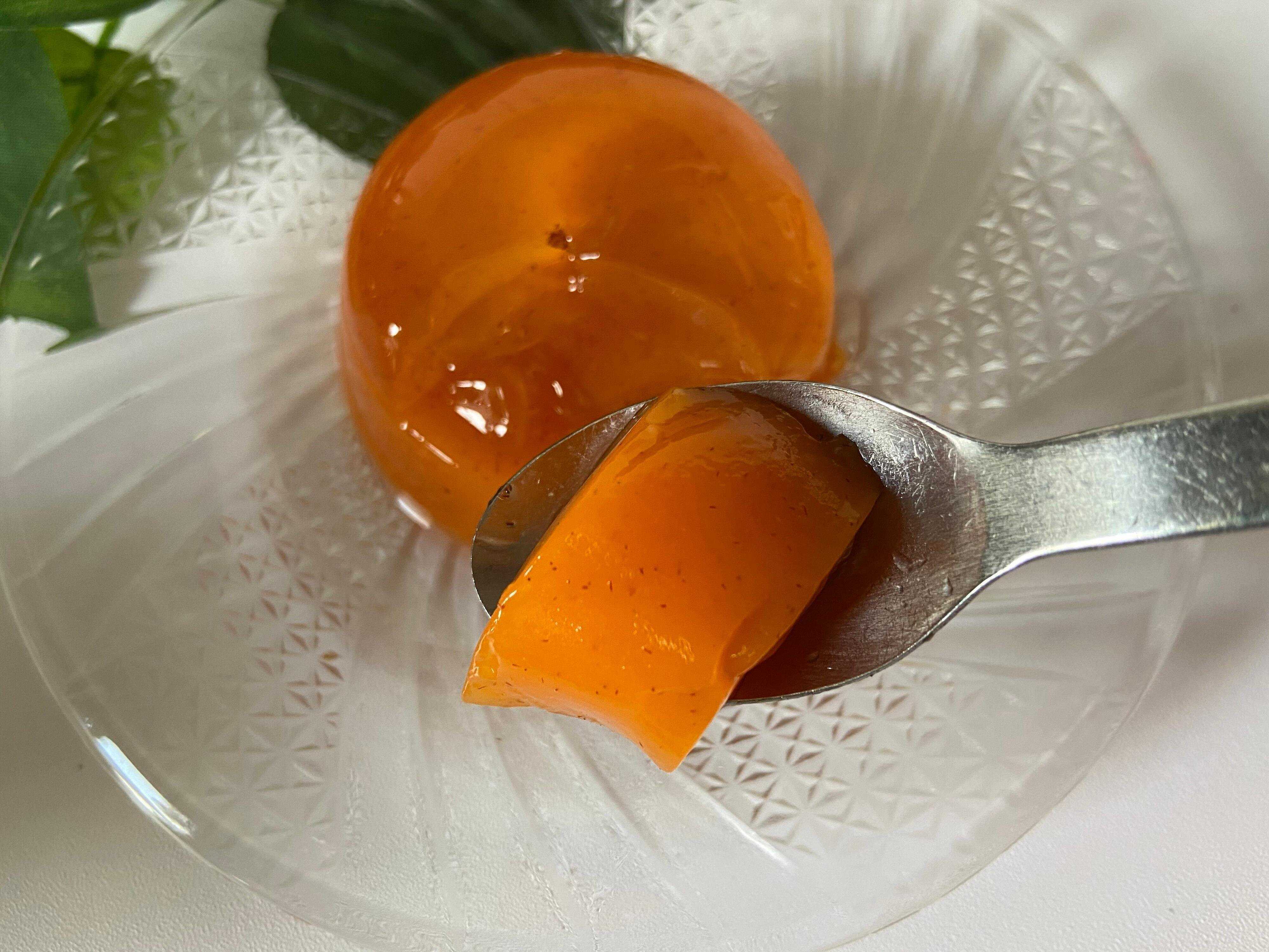 柿とゼリー部分を食べてみました。もっちりぷるぷるの食感でほんのり柿の風味がします。柿はシャキッとした食感。