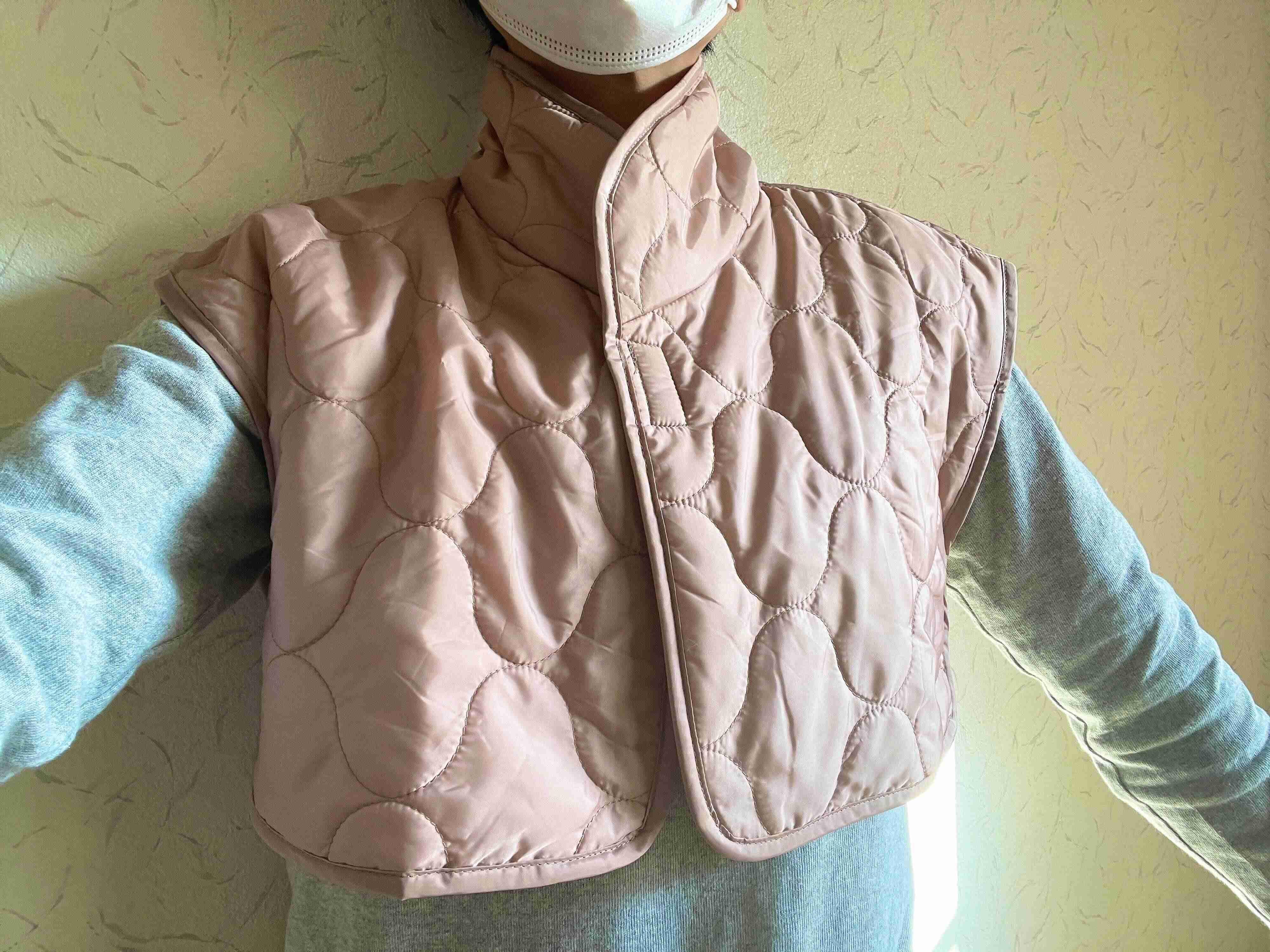 首の立ち上がりも高いので、首元をすっぽり覆ってくれます。首の冷えも防げますよ。