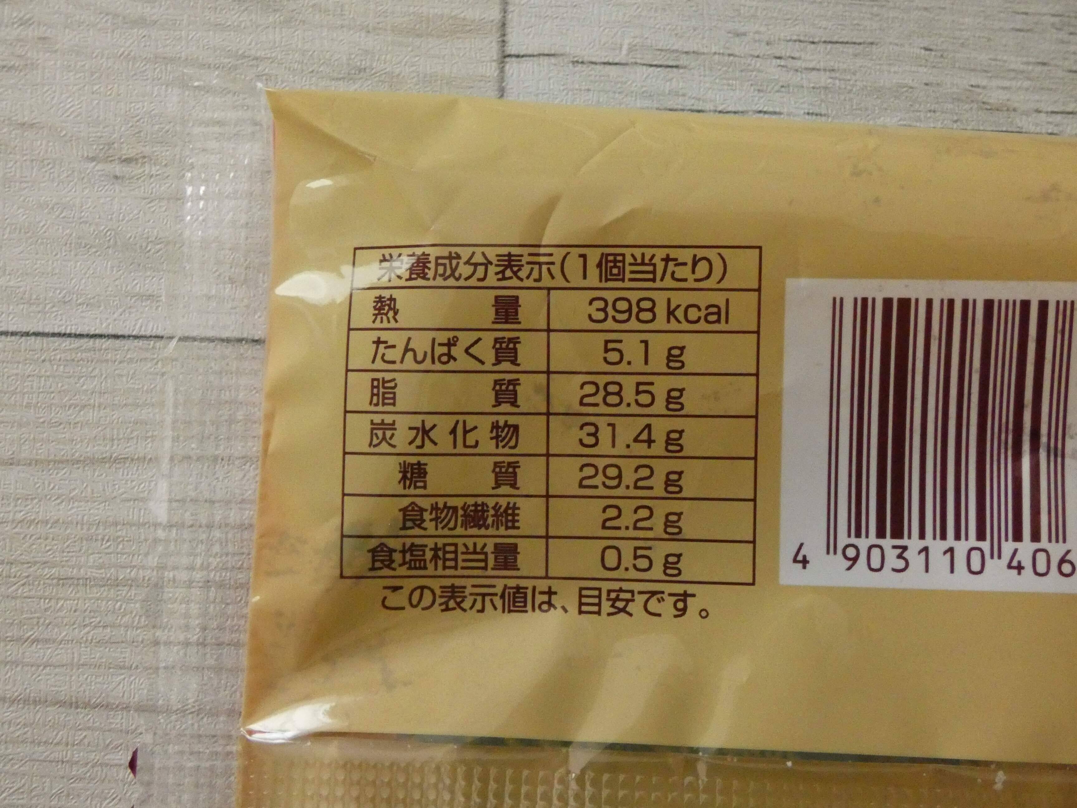 栄養成分表示を見ると1個のエネルギーは398kcal。デニッシュ生地に発酵バター入りなので、予想通りのカロリーの高さです。