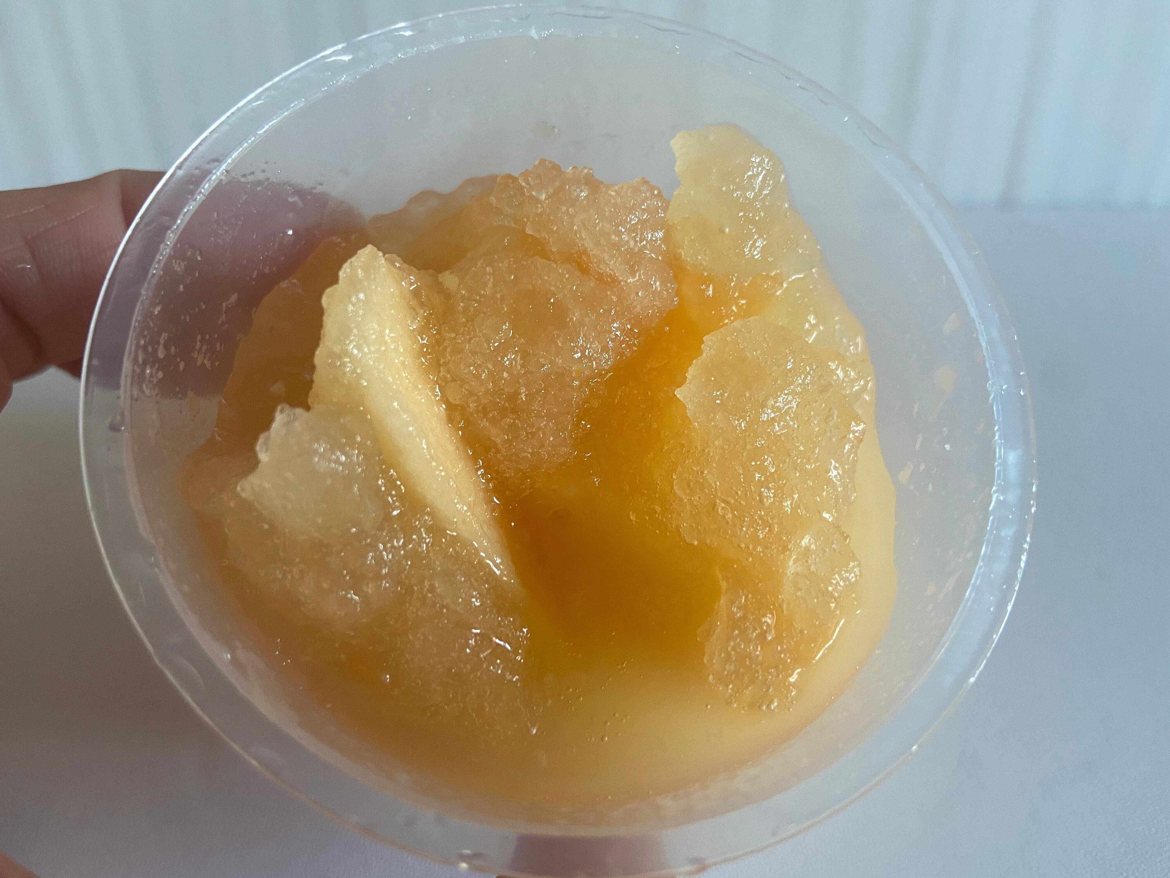 一口大にカットされたオレンジシュガーメロンは3つ入っていて、淡い色をしていますがしっかり熟して甘みがあります。メロンのやさしい甘みのジュレはふるふるの柔らかい食感。