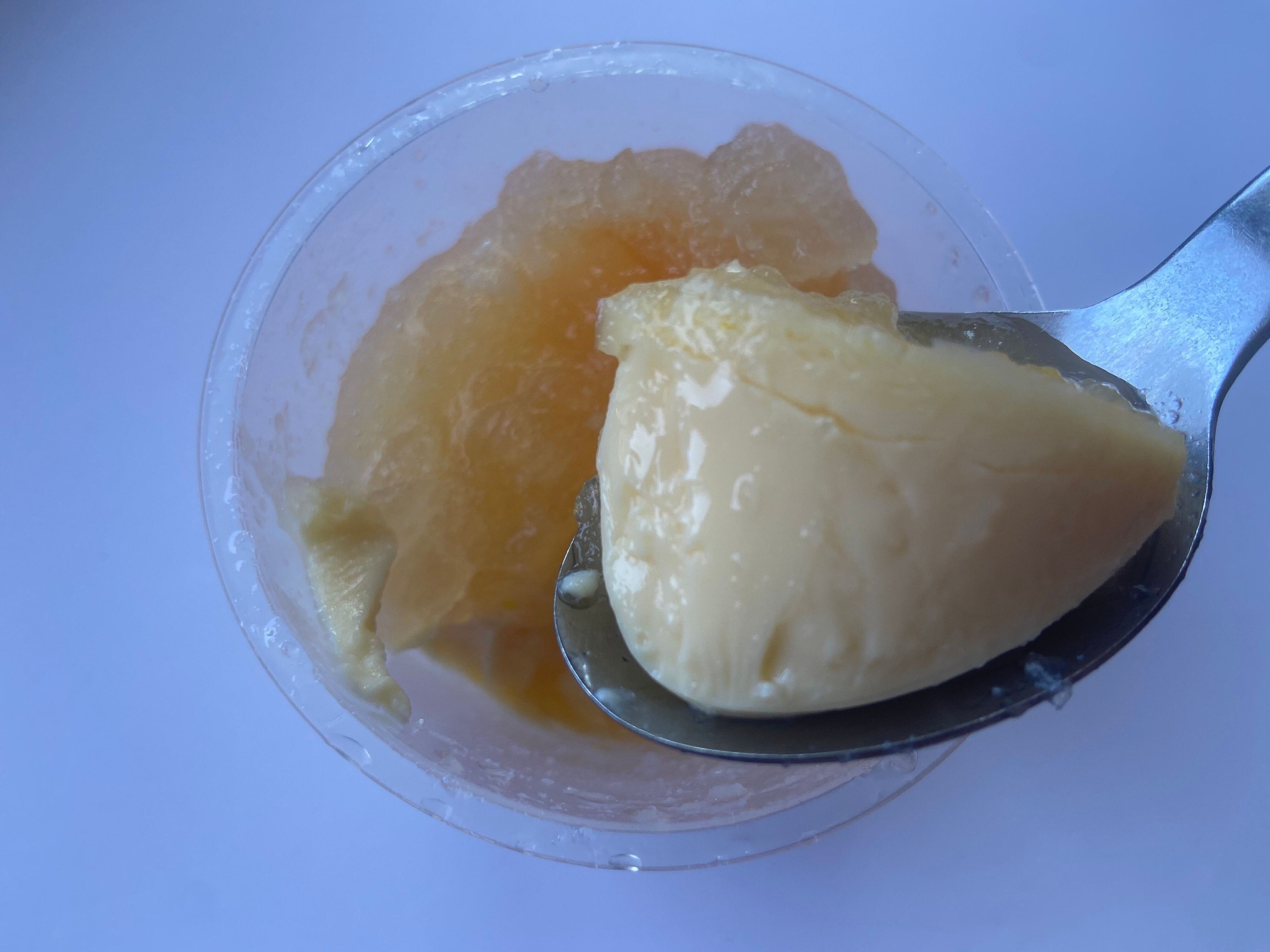 下にあるプリンは成城石井で人気の、シンプルで王道の焼きプリン。しっかりたまごの味がするちょっと固めのどこか懐かしい味わい。