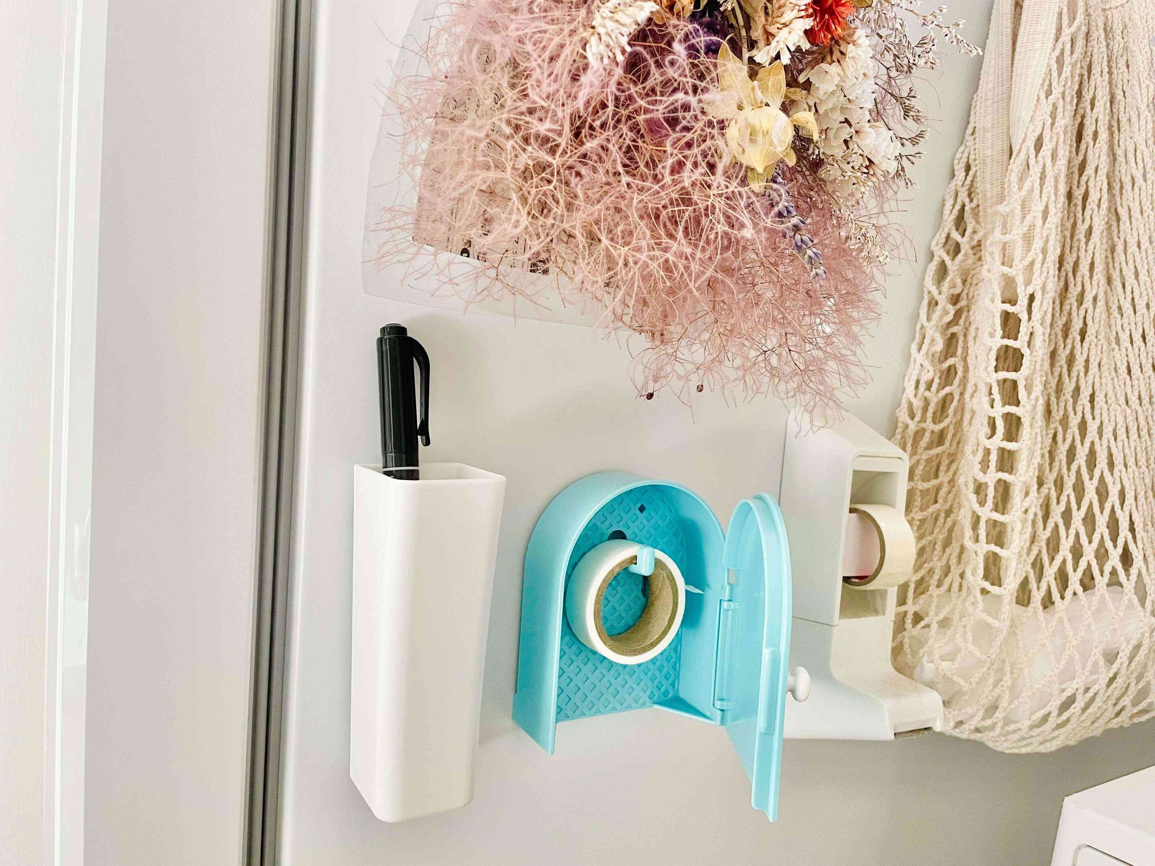 輪ゴムフックにマスキングテープをかけて、となりには油性ペンを。冷蔵庫につけておけば、賞味期限などをサッと記入できて便利です。