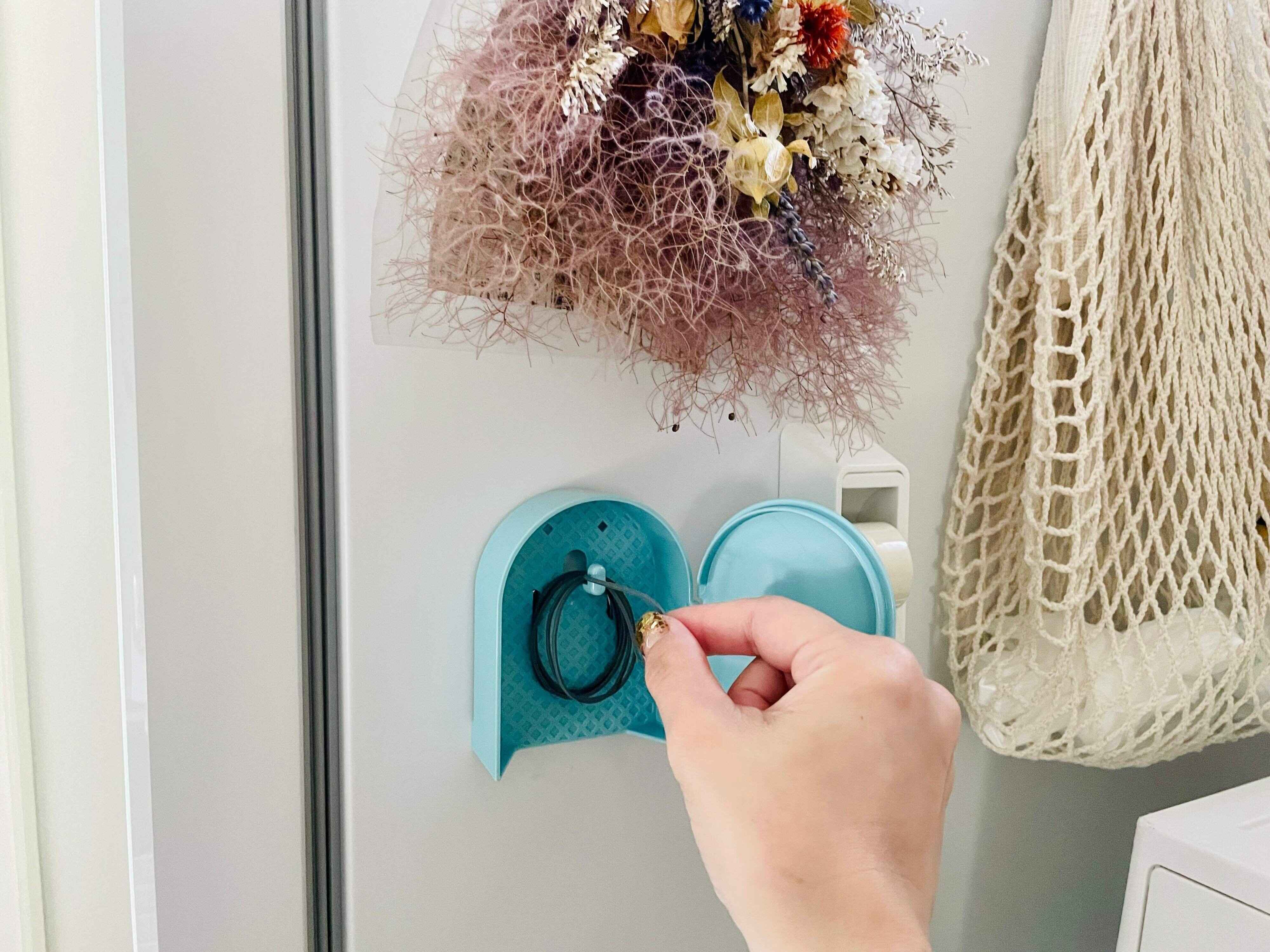 ドアを開けると、中に輪ゴムをかけるフックがついています。ドアがあることで、生活感が隠せるだけでなく、ほこりも防げますね。